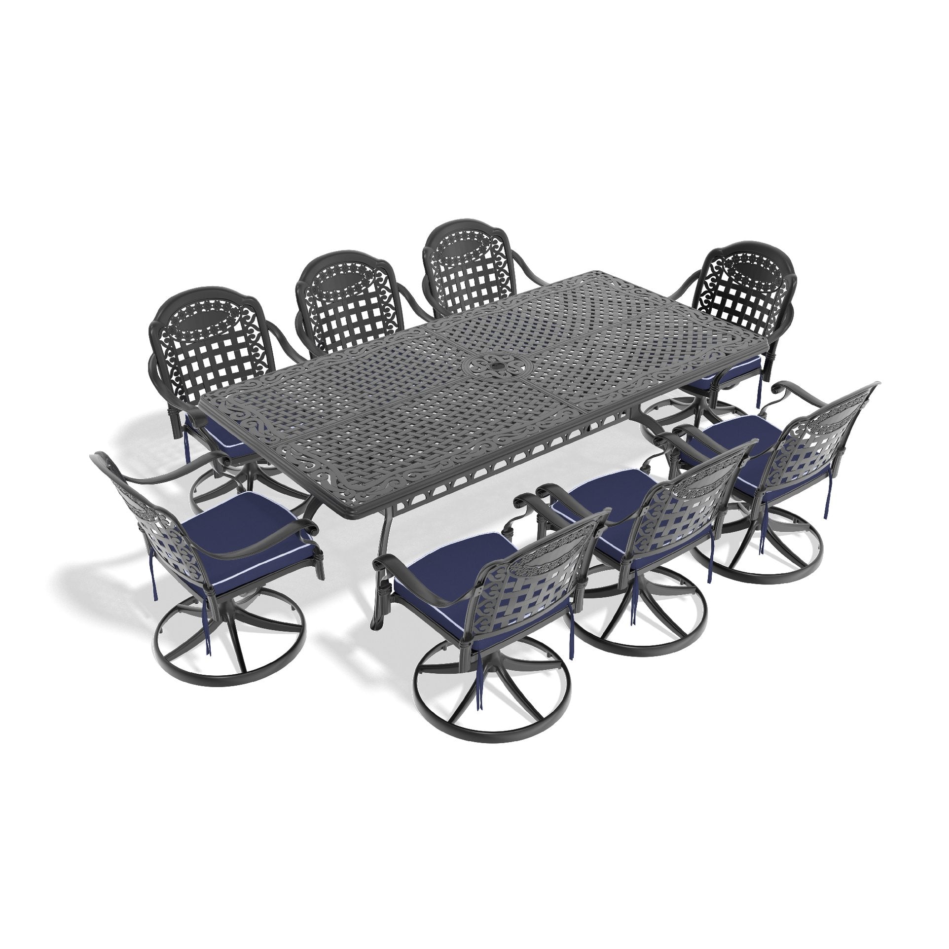 Enjoy outdoor dining and entertaining with this durable 9-piece all-weather cast aluminum set designed for comfort, style, and low maintenance. The set includes eight swivel chairs with plush cushions and a spacious rectangular dining table with an umbrella hole—perfect for family meals, backyard gatherings, or patio parties. Built from powder-coated cast aluminum, the set resists rust and weathering while offering sturdy performance season after season.
