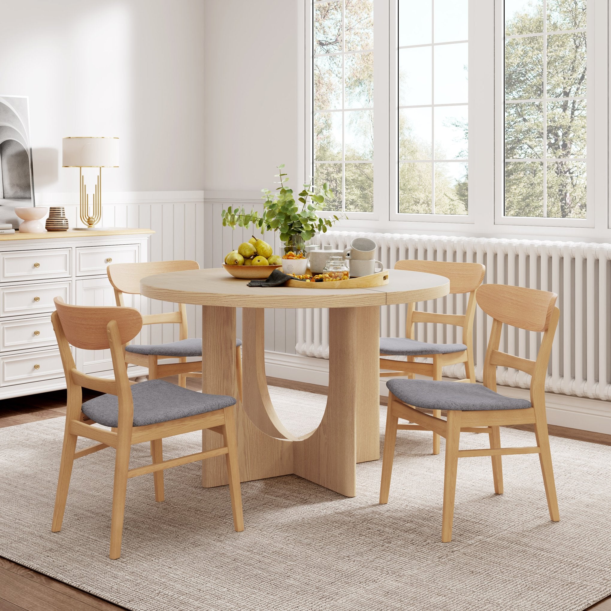 Elevate your dining space with this stylish five-piece set that blends mid-century modern design with everyday comfort. Featuring a round wood table and four upholstered chairs, the set pairs clean lines, sturdy construction, and soft fabric seating to create a welcoming focal point for meals, conversations, and gatherings.