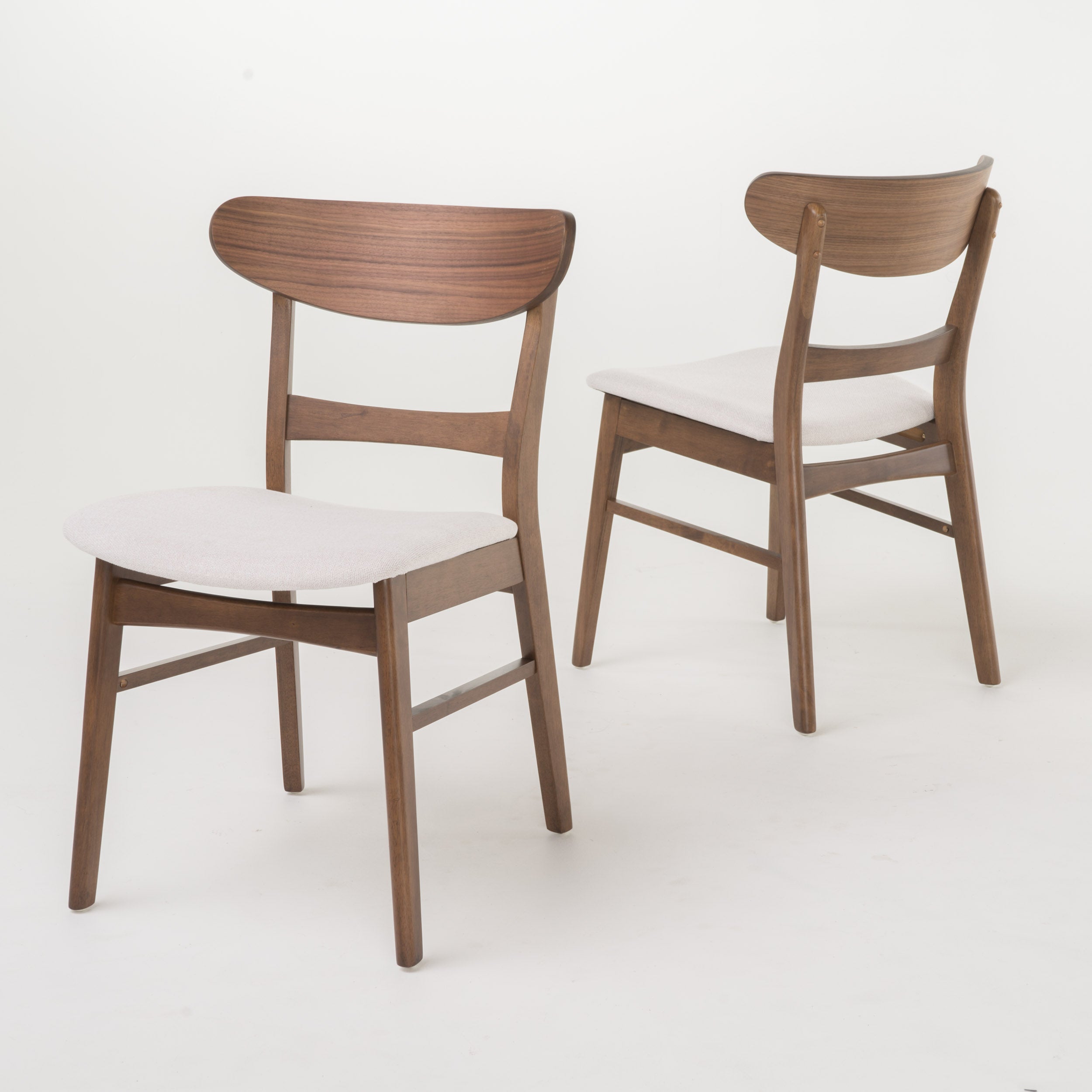 - Round out your dining room table in style with this side chair! Featuring a curved backrest and iconic splayed legs, this mid-century modern dining chair adds of-the-moment style to your space. It's made from solid rubberwood in a neutral hue, and its curved seat is upholstered with foam and a poly-blend fabric, available in a variety of different hues to suit your space. Plus, it arrives in a set of two. Full assembly is required.