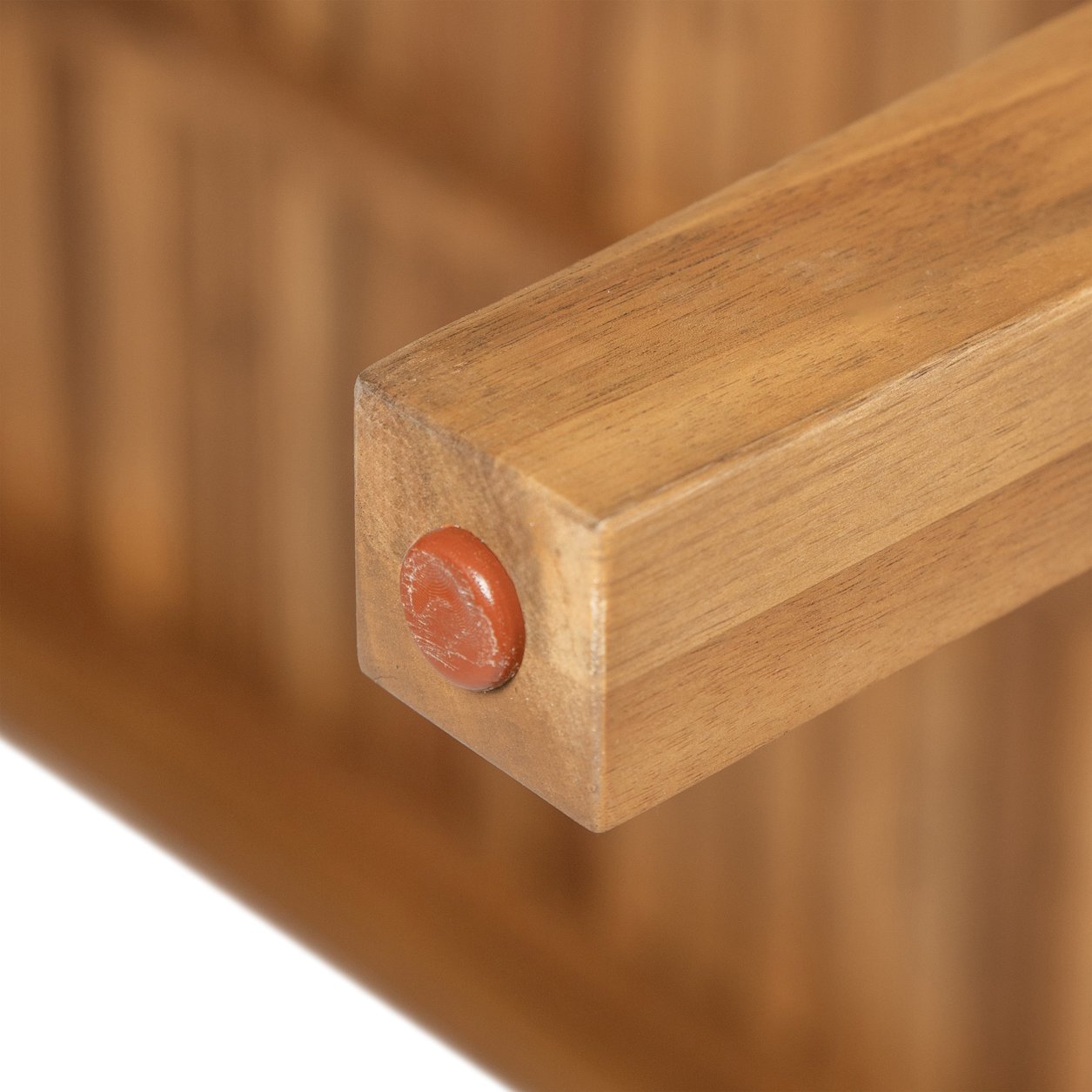 - Materials & Finish: Solid acacia wood with a natural finish; beige fabric seat cushions