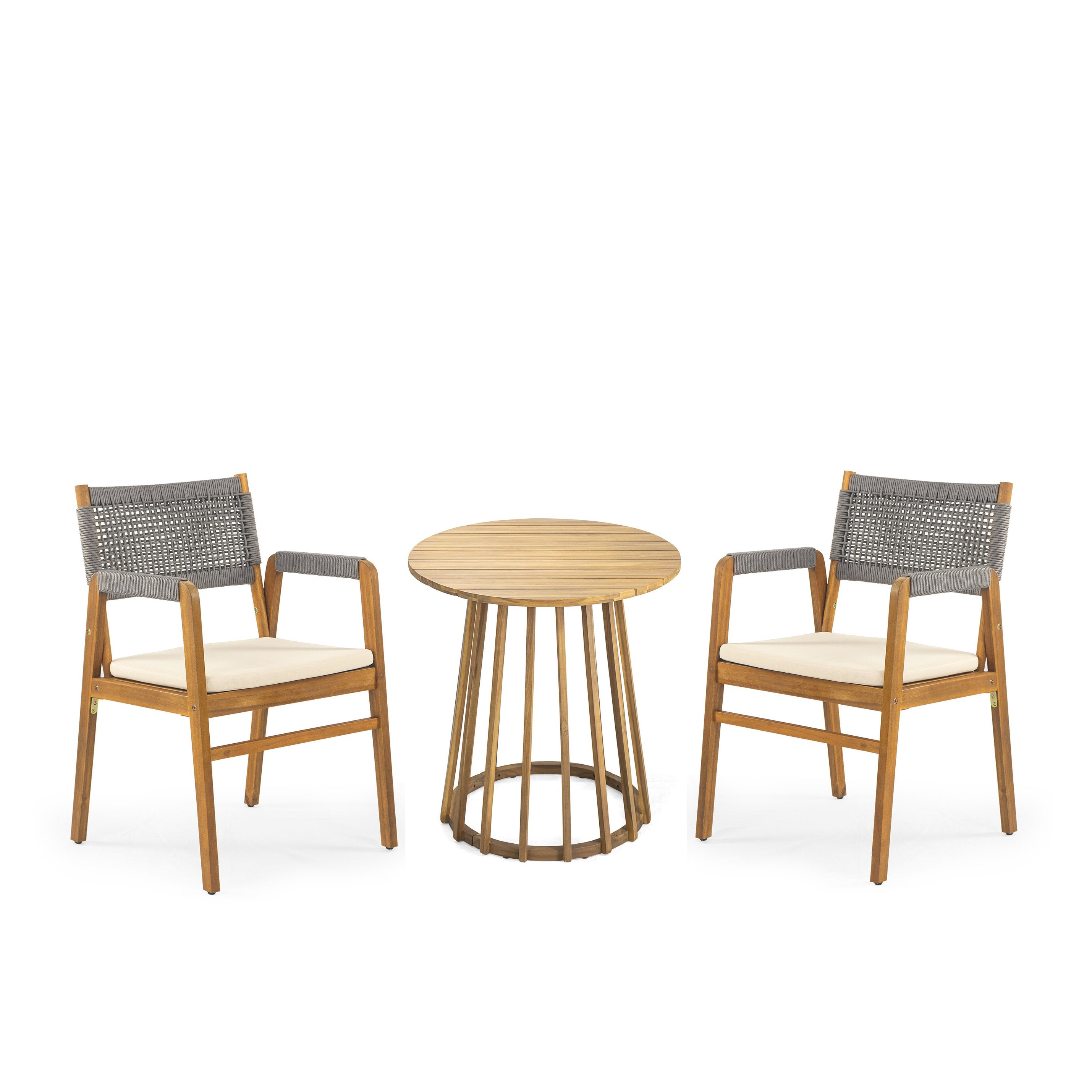 - Enhance your outdoor space with the stylish and durable Outdoor Acacia 3-Piece Bistro Set. Featuring two comfortable chairs with rope-woven backrests and cushioned seats, alongside a sleek slat-panel tabletop, this set combines modern design with the natural beauty of acacia wood.