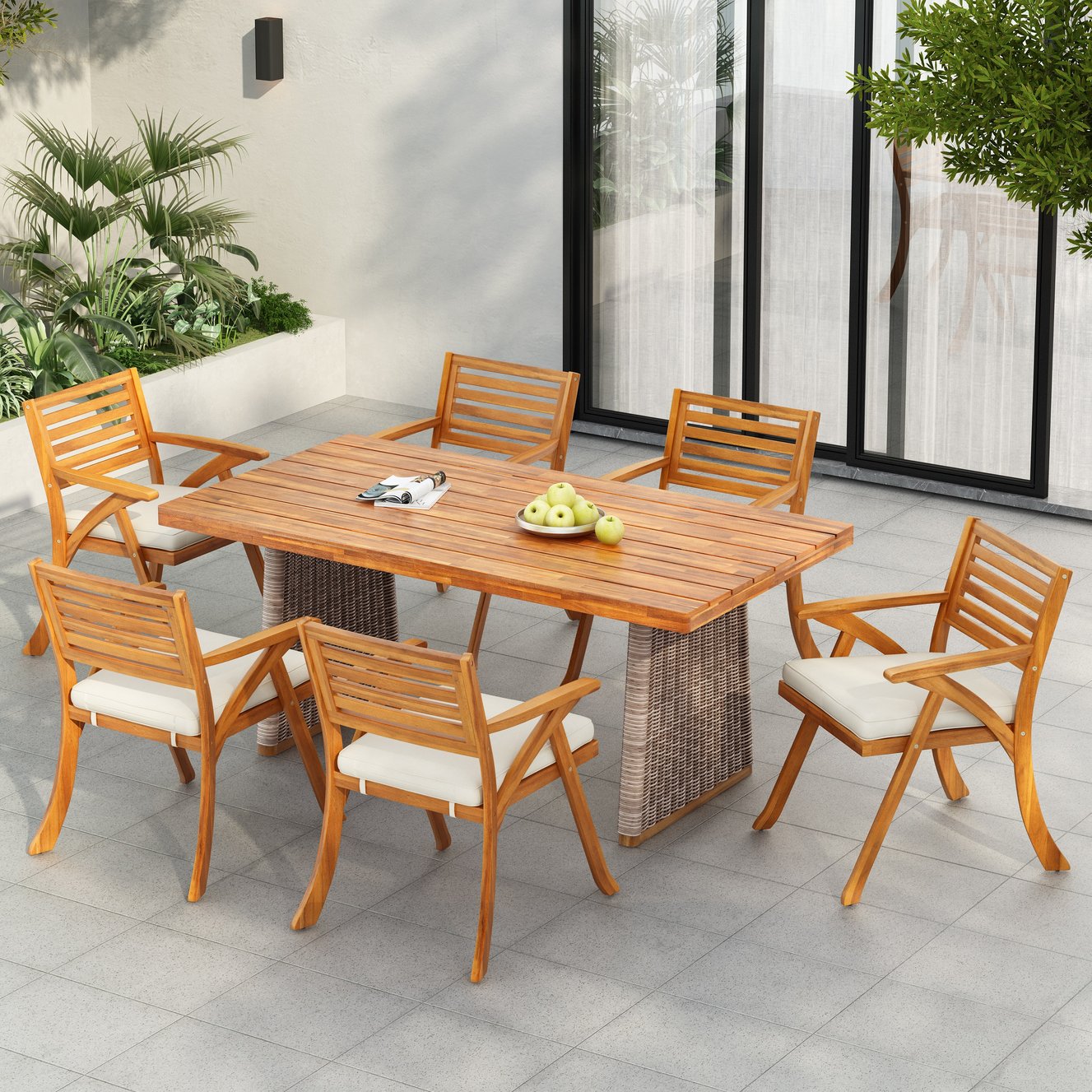 Enjoy relaxed outdoor dining with this elegant 7-piece acacia wood set, combining durable hardwood construction with handwoven rattan accents for a warm, resort-style look. Designed for comfort and everyday use, the set includes a generous dining table and six cushioned armchairs that balance sturdy support with breathable wicker detailing—ideal for patios, decks, or garden dining.
