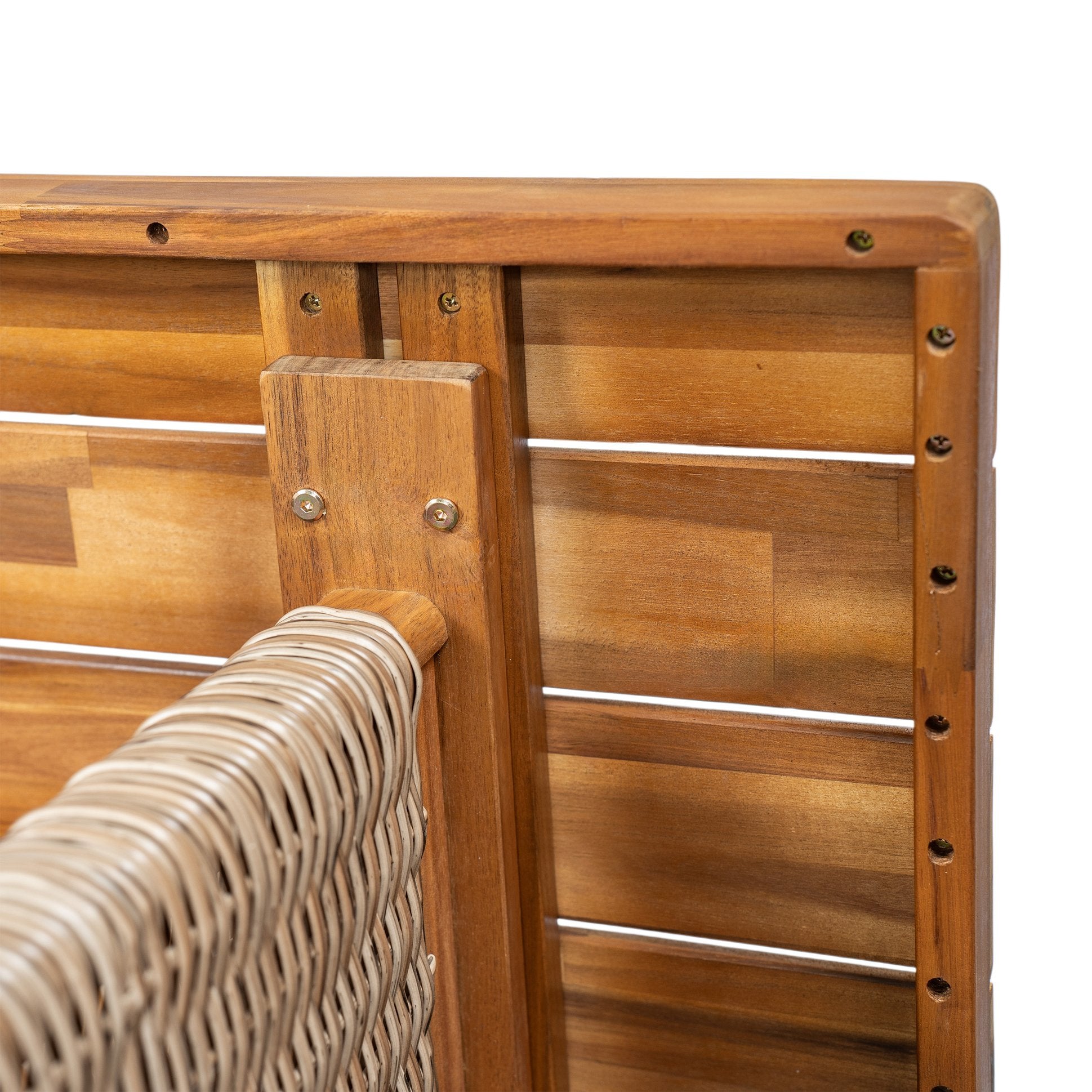 - Table construction: Solid acacia wood top with PE wicker-wrapped legs in brown for added texture and outdoor durability.