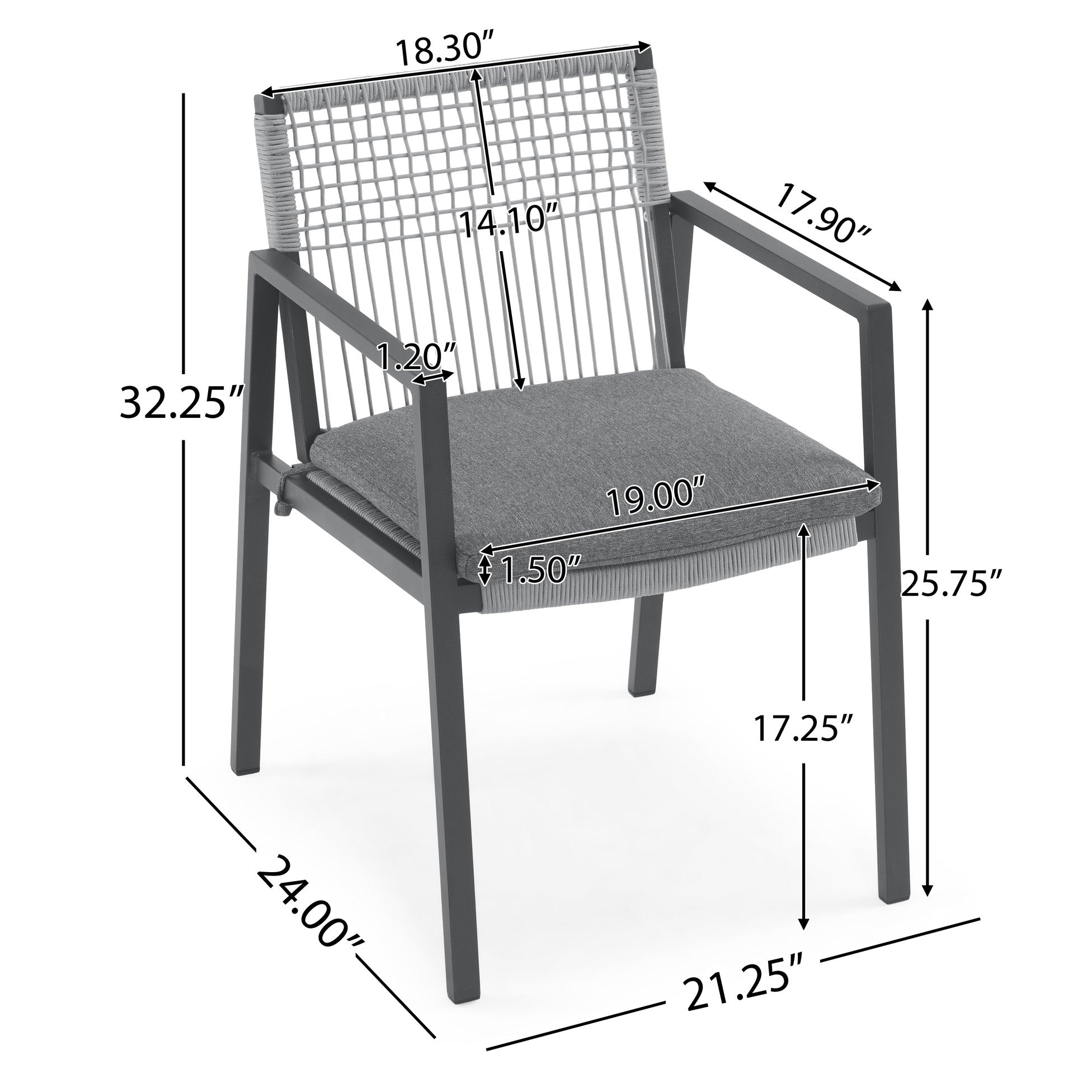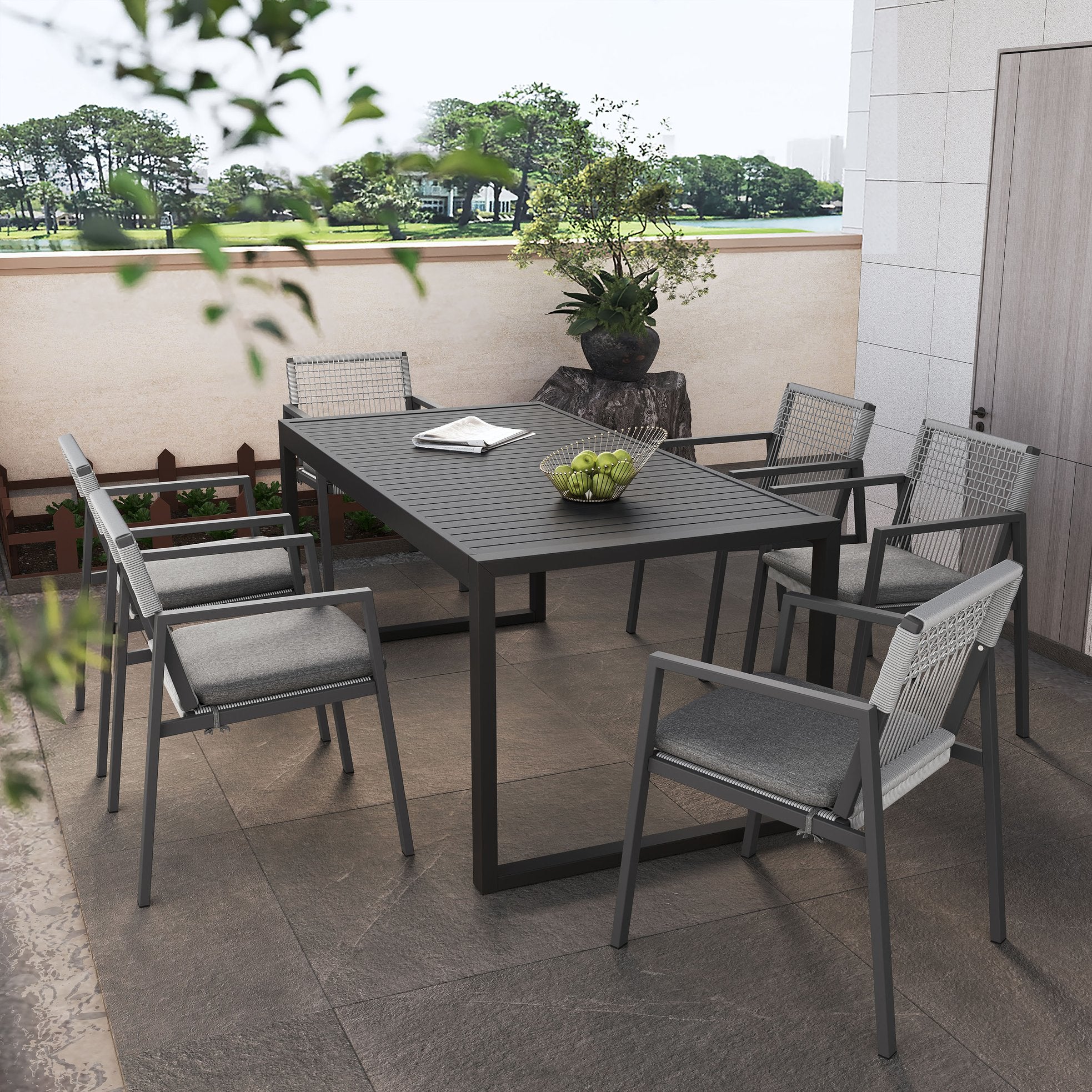 Upgrade your outdoor dining experience with this modern, weather-ready set that blends durable materials and contemporary style. Perfect for patios, decks, or garden terraces, the set includes a spacious aluminum table plus six rope-woven chairs designed for comfort and low maintenance—making it ideal for everyday meals or entertaining guests.