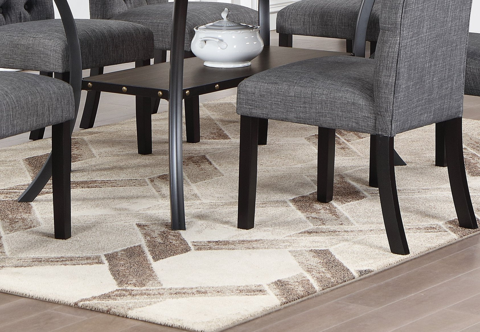 - Seating Comfort: Side chairs upholstered in charcoal fabric with padded seats and tufted backs for plush comfort and refined appeal.