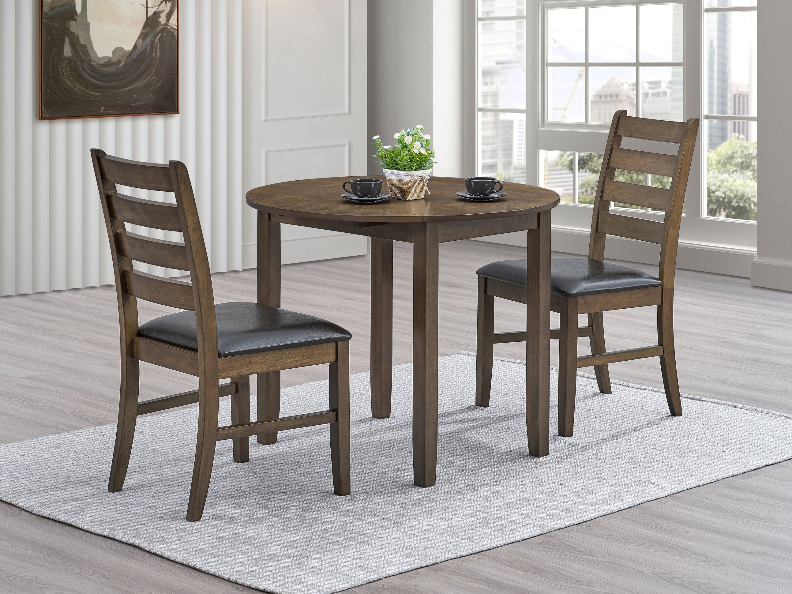 Enjoy cozy meals and stylish small-space living with this compact 3-piece dining set in a warm walnut finish. Designed for apartments, breakfast nooks, and multi-use rooms, the set pairs a space-saving drop-leaf table with two padded side chairs for comfortable seating without compromising on style or durability.
