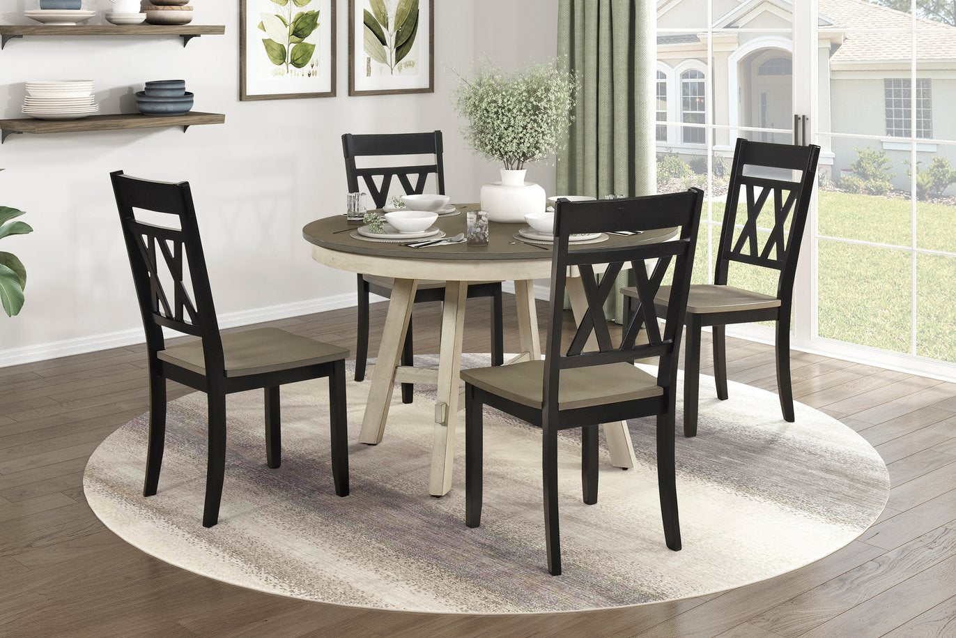 Bring rustic warmth and modern farmhouse flair to your dining room with this two-tone 5-piece dining set. A round greywash tabletop paired with antique-finished legs creates a welcoming focal point, while X-back side chairs combine classic silhouette and everyday comfort. Ideal for casual meals or cozy gatherings, the set balances durability and refined country-style design.