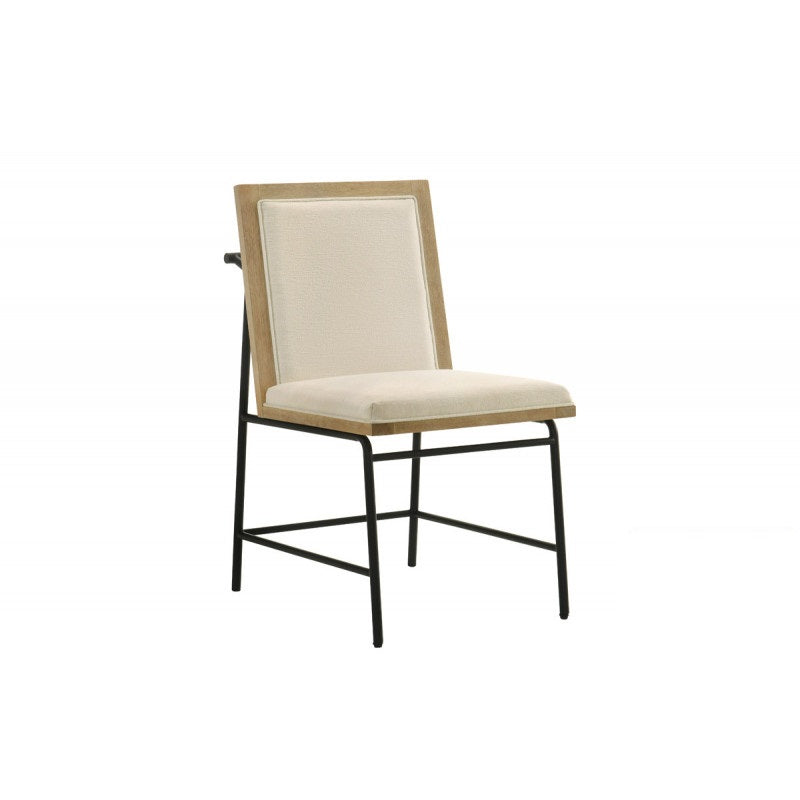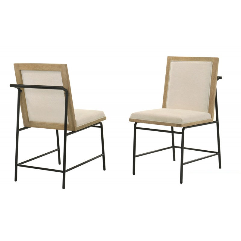 - Materials & finish: Oak veneer tabletop with panel legs and driftwood finish; beige upholstered seats; black metal chair legs for a modern-contrast look.
