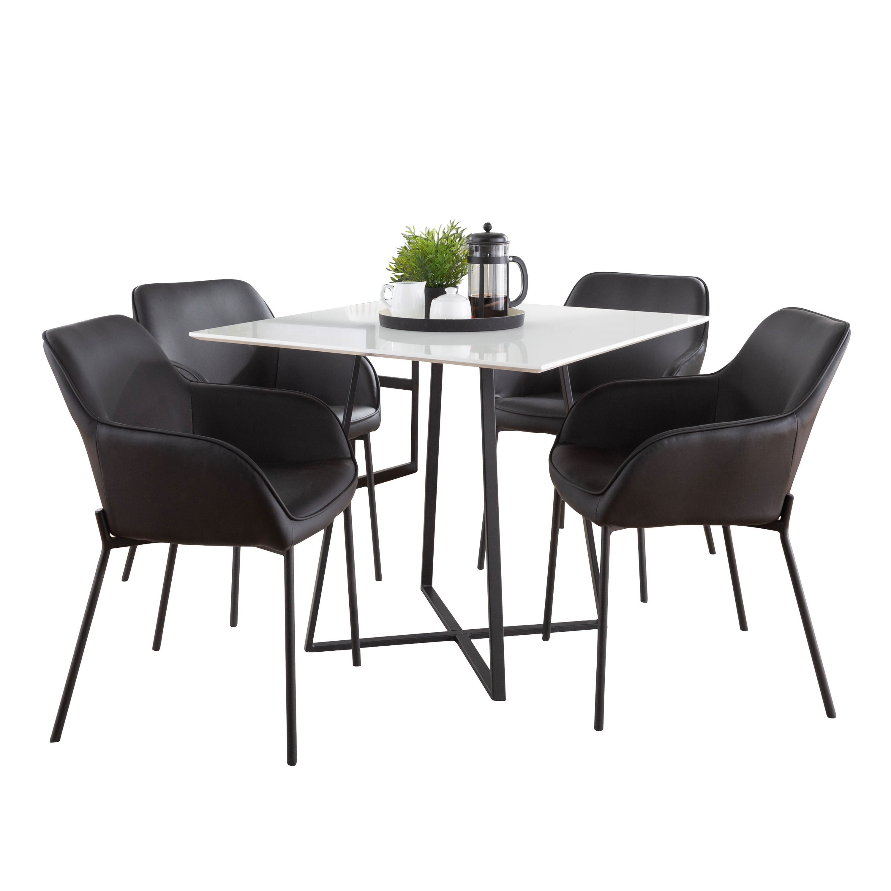 Bring modern simplicity to your dining area with this sleek 5-piece set that blends black metal framing, white wood tabletop, and comfortable black faux leather seating. Its clean lines and compact square footprint make it ideal for contemporary homes, apartments, or breakfast nooks—delivering style and practical durability for everyday use.