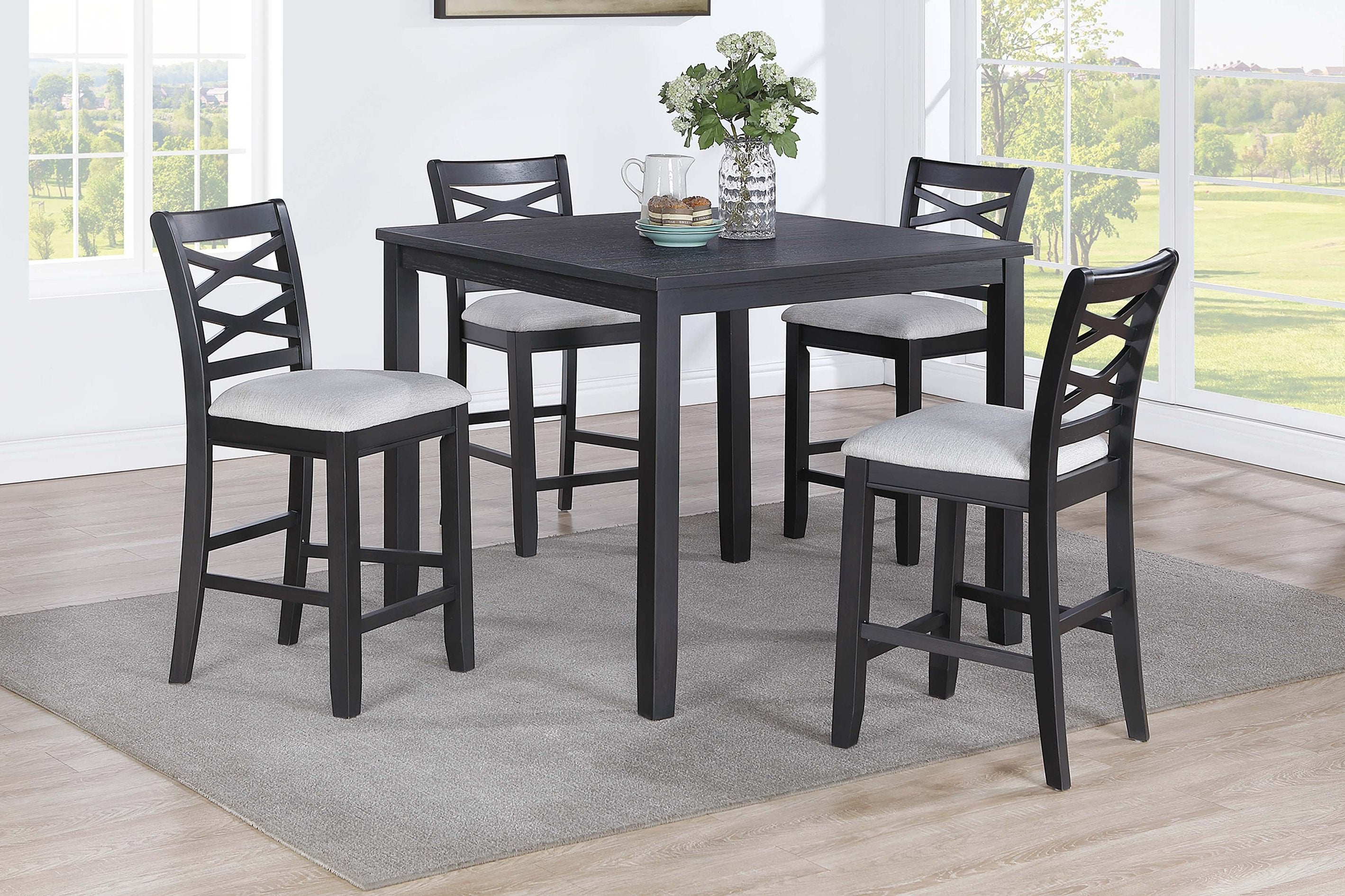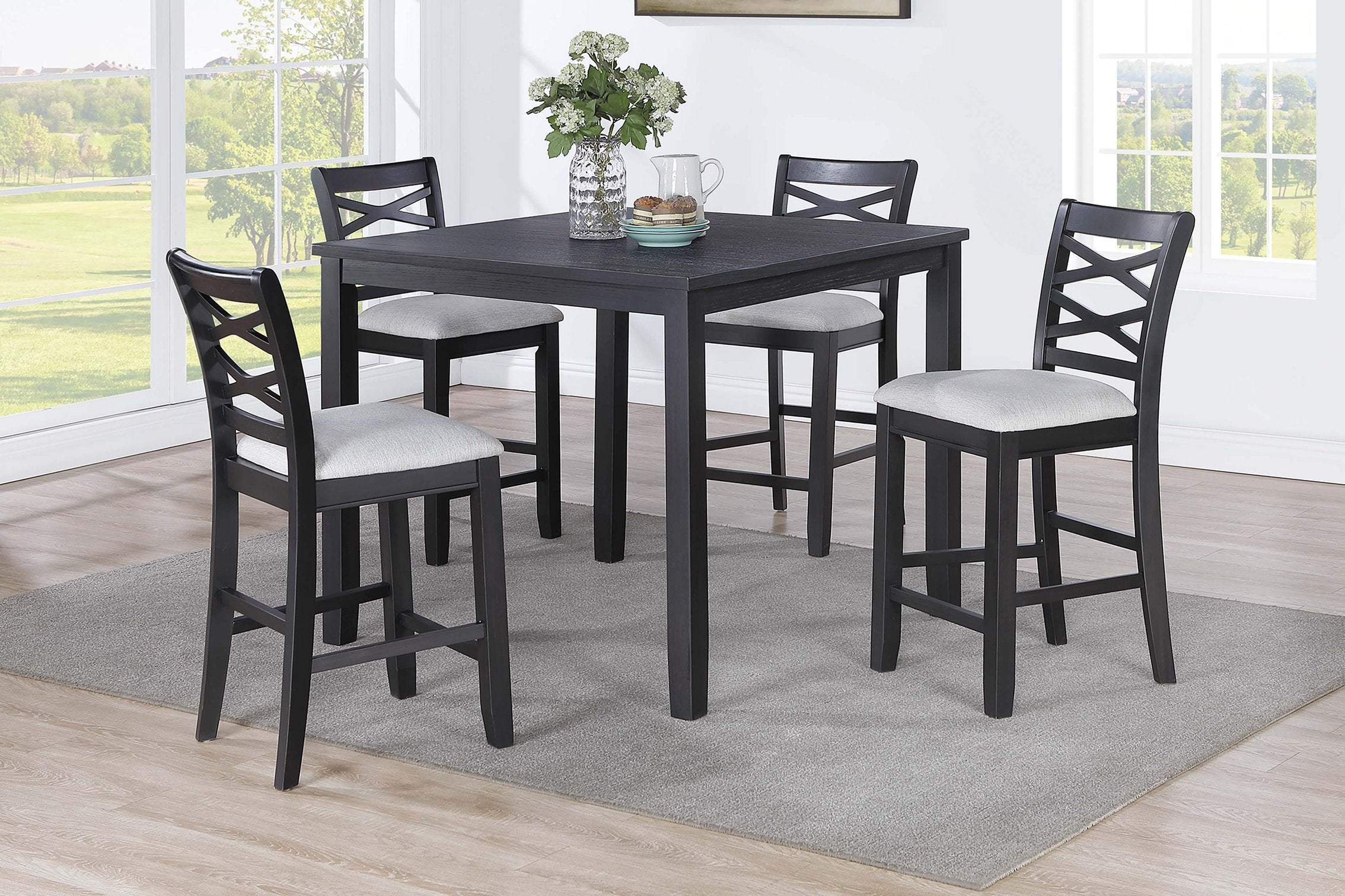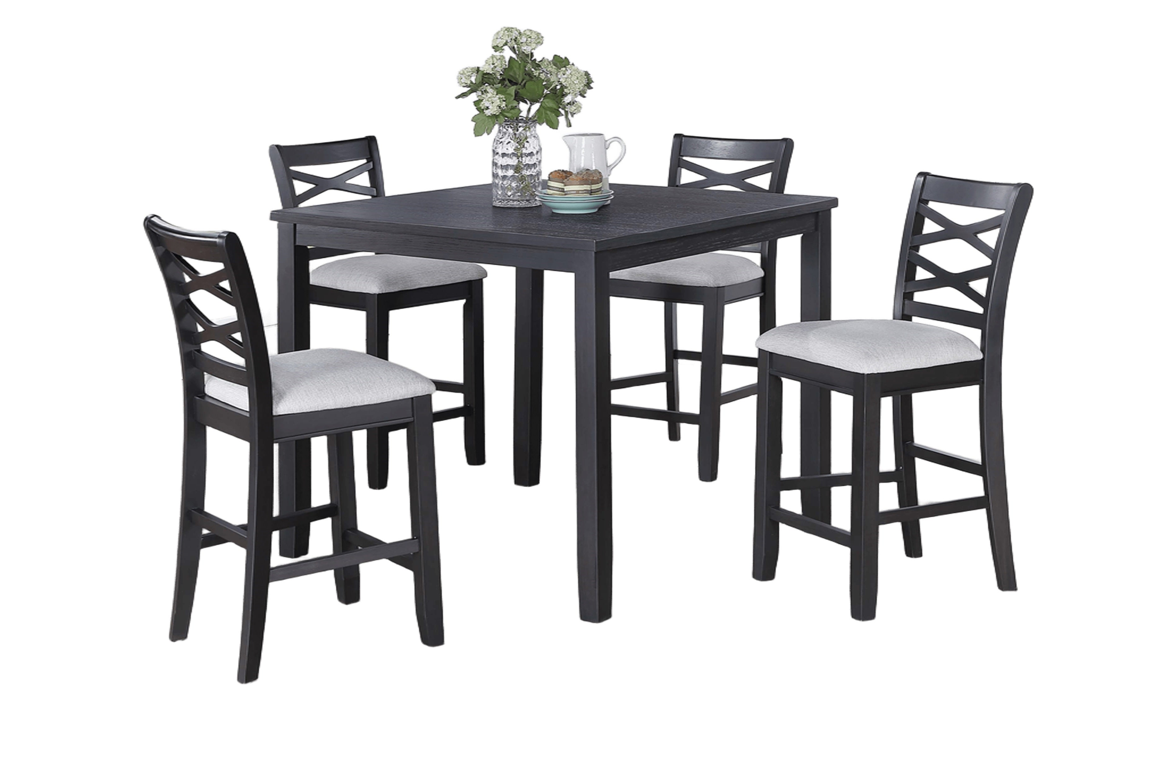 Transform your dining area into a warm, modern gathering place with this 5-piece counter-height dining set. The charcoal finish and clean lines create a contemporary yet timeless look, while the elevated square table and cushioned cross-back chairs encourage relaxed conversation and comfortable dining for family and guests.