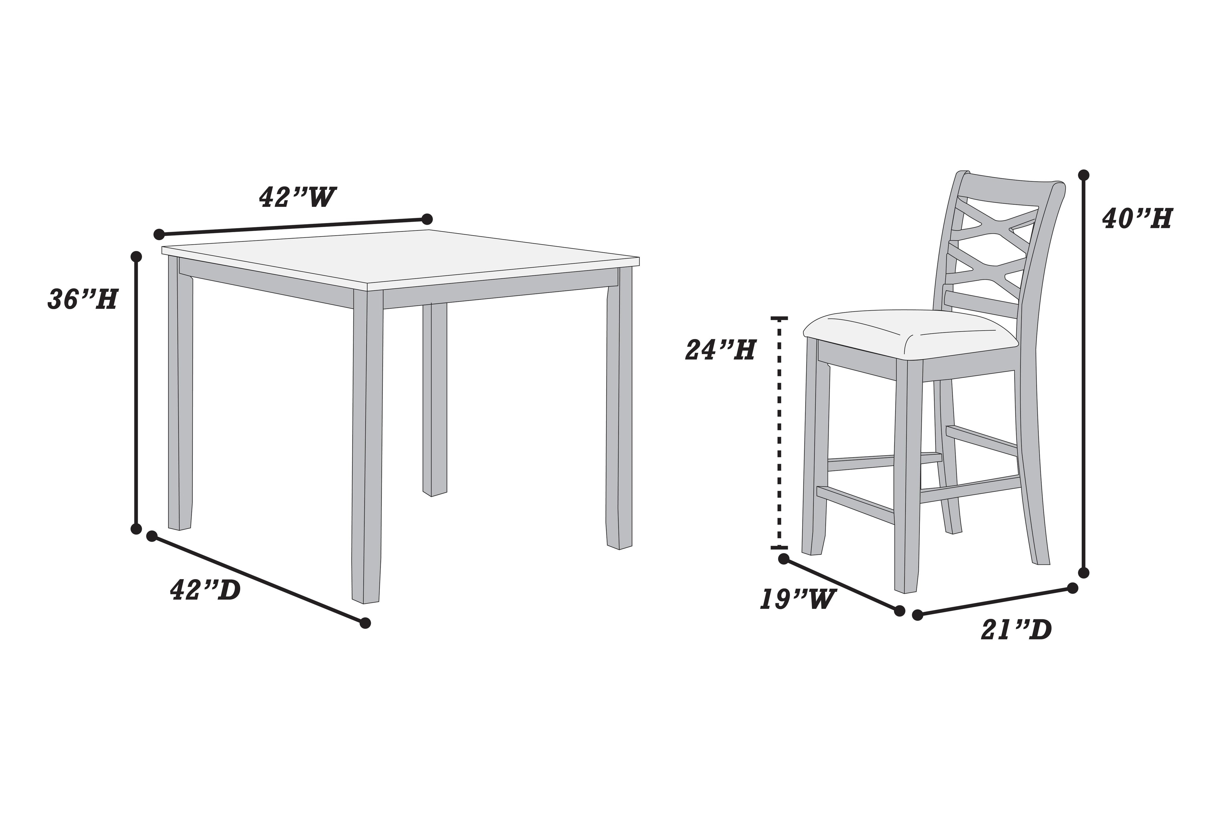 - Product dimensions (prominent): Dining Table: 42" W x 42" D x 36" H. Side Chair: 19" W x 21" D x 40" H (seat height: 24" H).