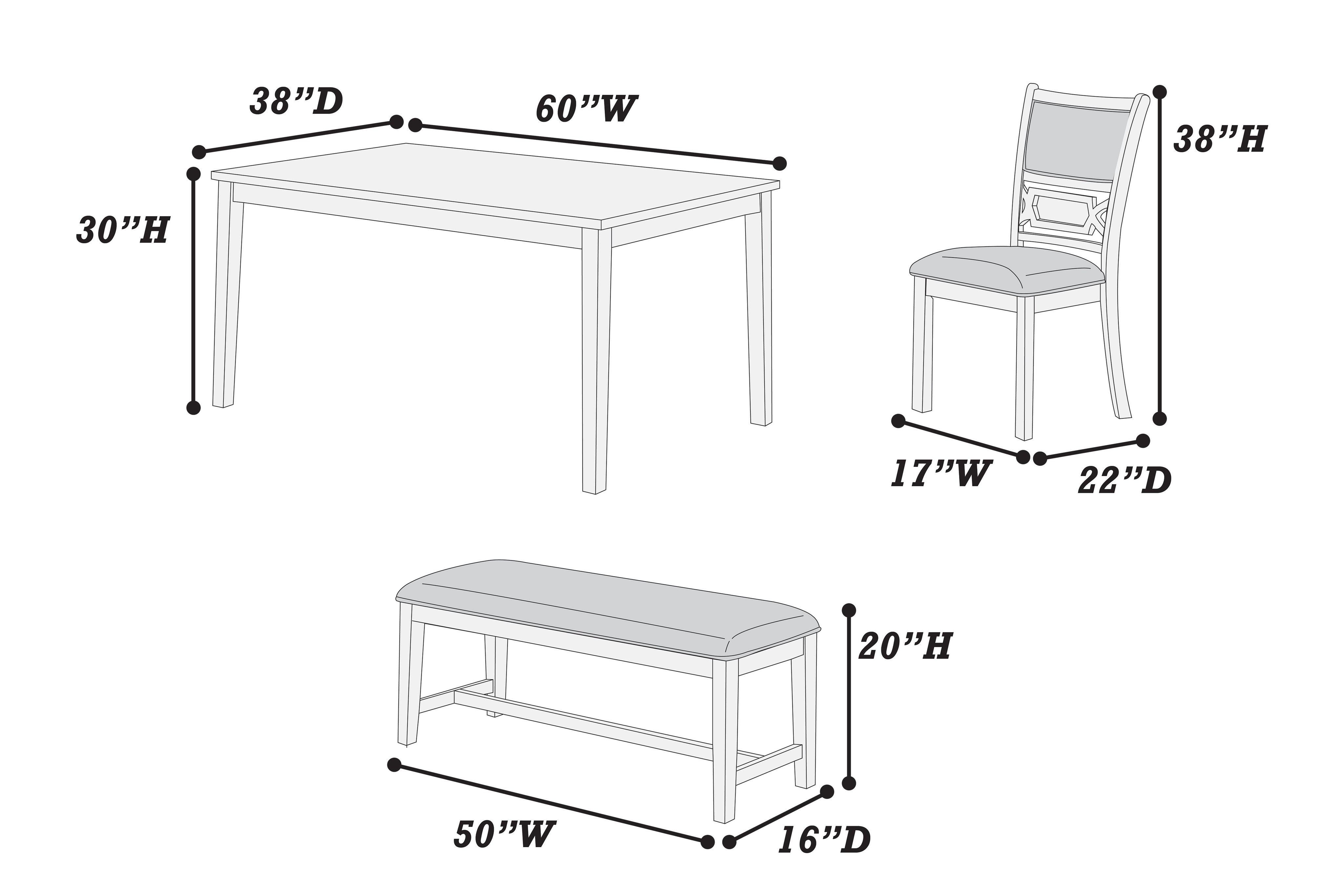 - Set includes: 1 dining table, 4 side chairs, 1 bench (assembly required)