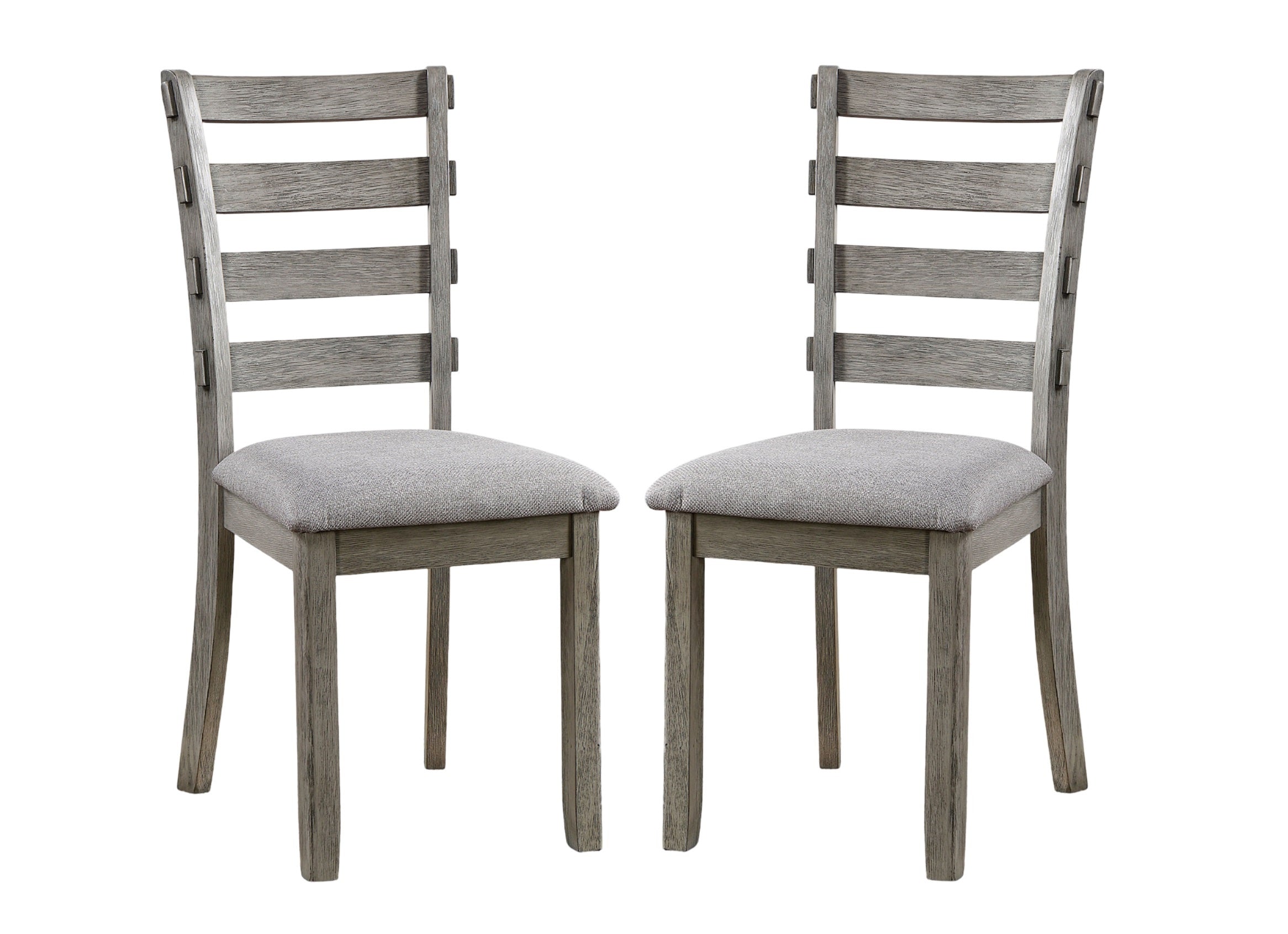 - Key materials & finish: Grey wood-look table top with diamond grain pattern; wire-brushed frame; soft grey linen-like fabric upholstery on seats