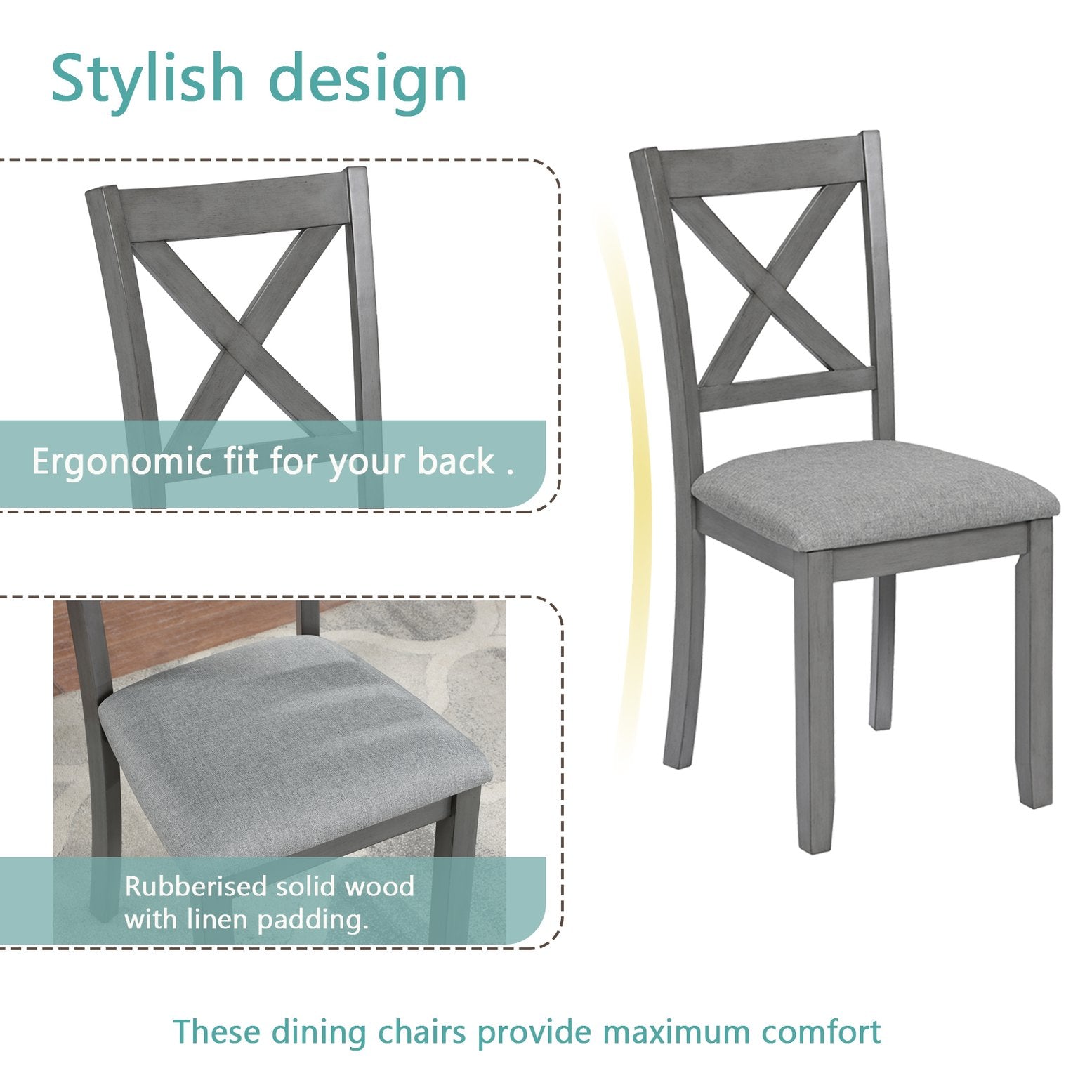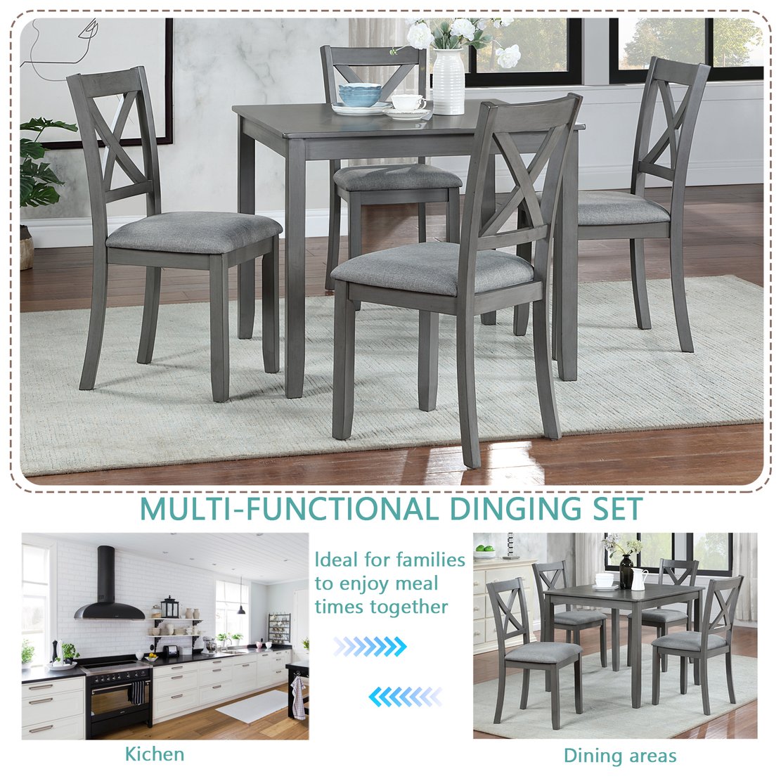 Bring modern elegance and everyday comfort to your dining space with this 5-piece solid wood dining set. Thoughtfully designed for small to medium dining rooms, kitchens, or living areas, the set pairs a spacious square table with four upholstered chairs featuring ergonomic X-shaped backrests and tapered legs. Durable materials and water/oil resistant surfaces make maintenance effortless, while quality construction ensures lasting stability and comfort for family meals or casual entertaining.