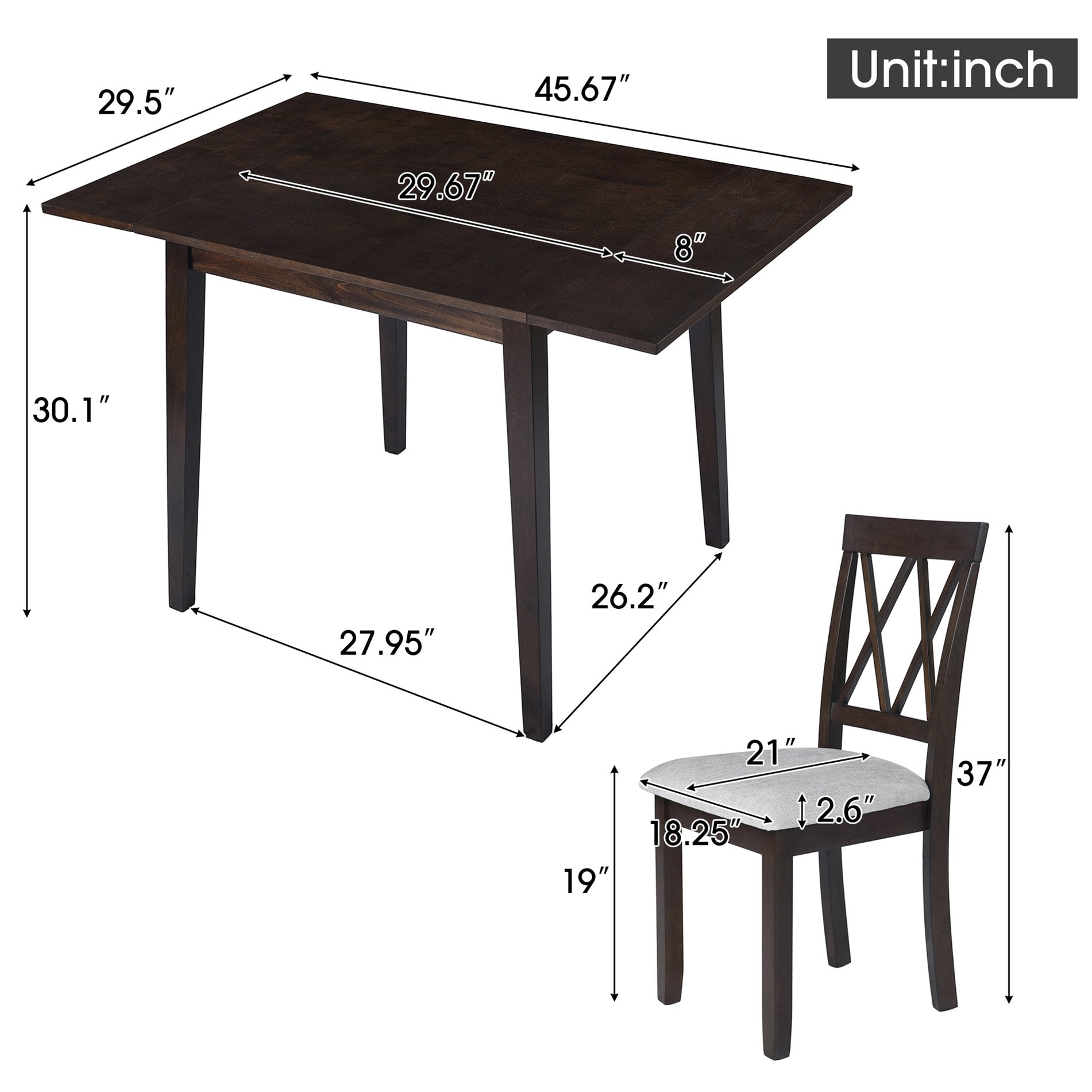 Transform small spaces into stylish, functional dining areas with this compact 5-piece farmhouse-style dining set. Ideal for apartments, kitchens, or breakfast nooks, the set includes an extendable drop-leaf table and four upholstered chairs designed for comfort and space-saving convenience. Thoughtful construction and durable materials deliver everyday practicality without sacrificing classic espresso-finish charm.