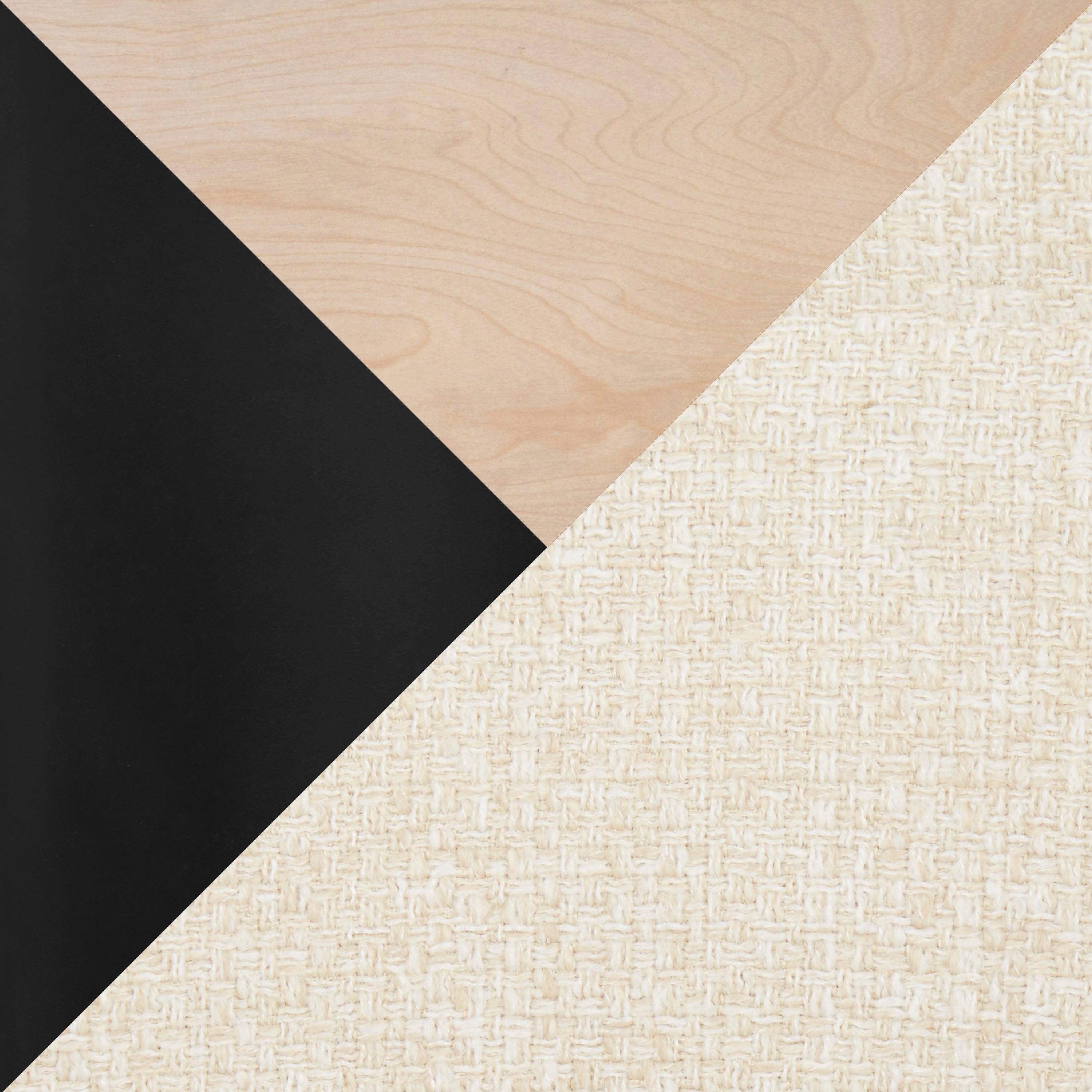 - Materials & Finish: Natural wood tabletop, sturdy black metal legs for table and chairs, and cream “noise” fabric upholstery for a neutral, textured look.