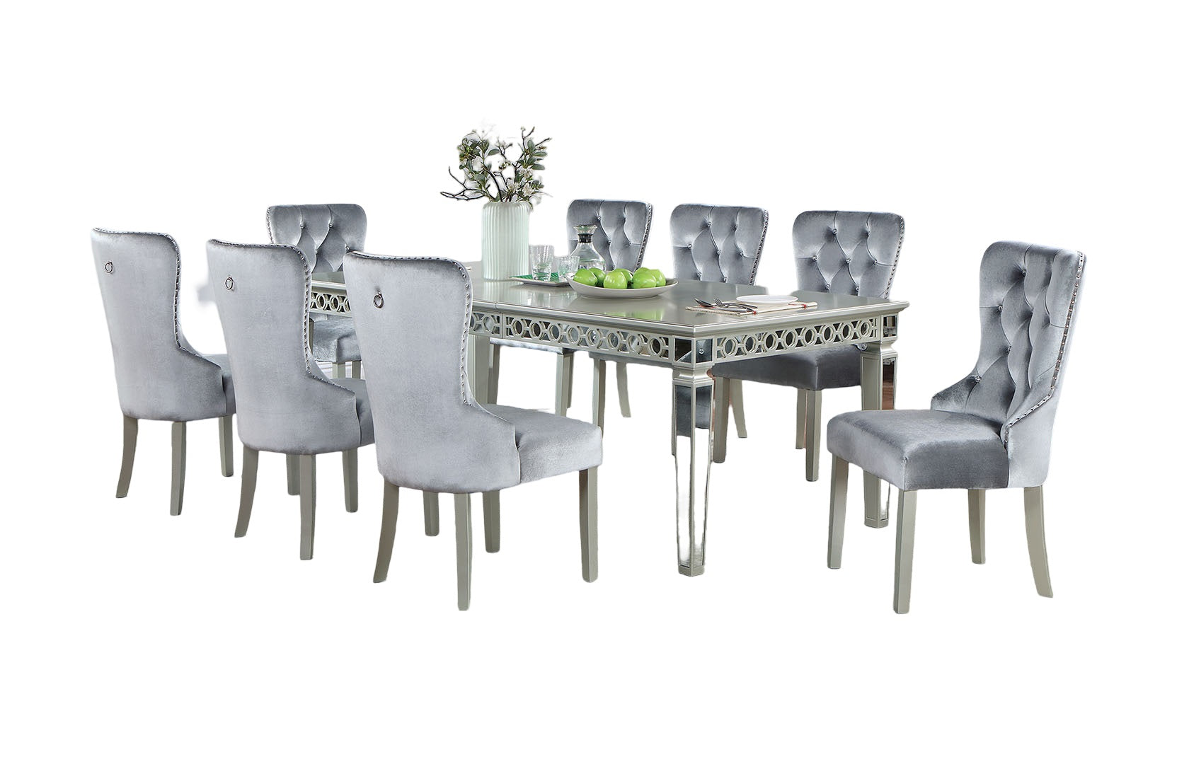 Elevate your dining room with a glamorous, contemporary set that blends mirrored accents, plush upholstery, and functional design. This 9-piece ensemble pairs a statement dining table with eight tufted wingback chairs to create an inviting, luxurious gathering space ideal for family dinners and entertaining.