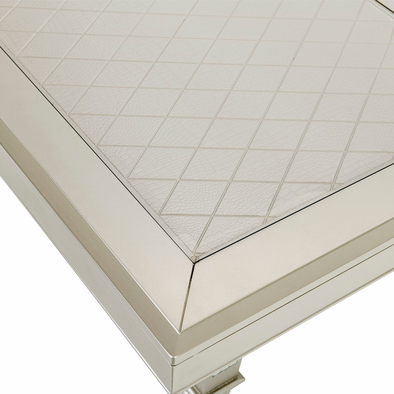 - Table Top: Inset glass panels over an embossed, diamond-patterned surface for a decorative, reflective look