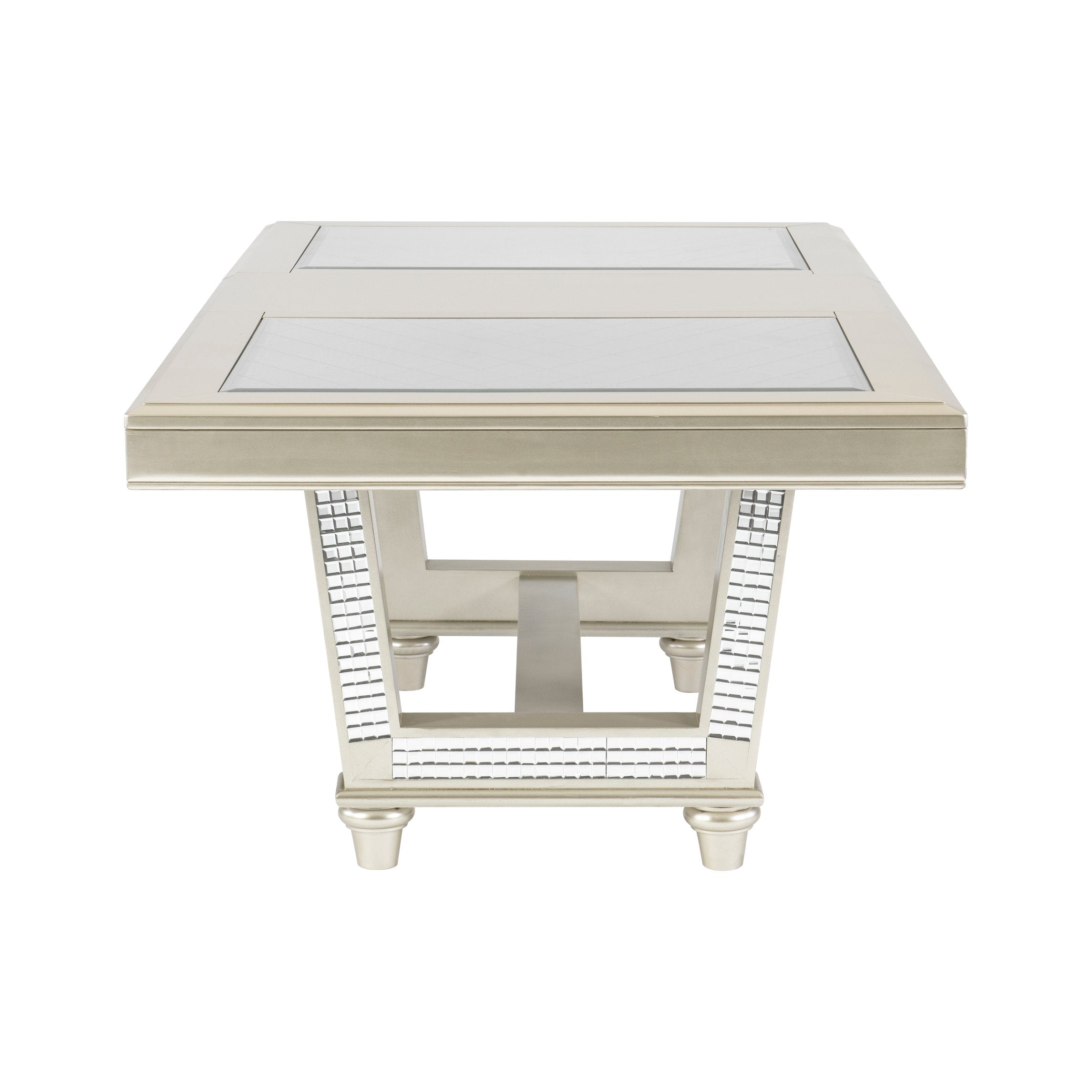- Signature Finish & Accents: Champagne finish with mirrored trim, acrylic crystal accents on chair backs, and turned feet for subtle traditional character