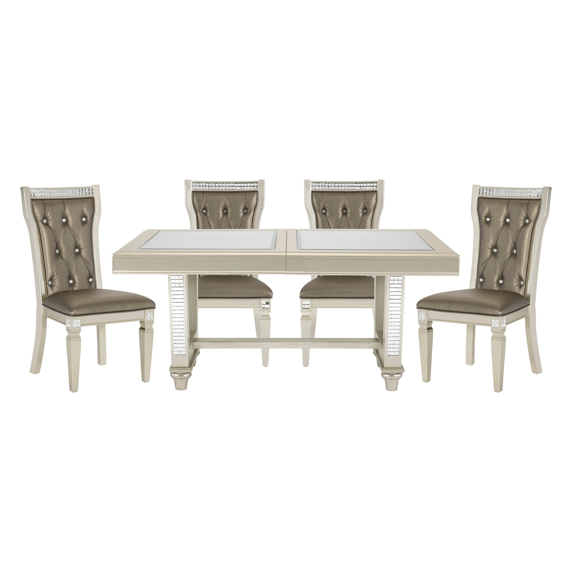 Elevate your dining room with the Juliette Collection — a glamorous, traditionally inspired 5-piece set that blends sparkling accents, refined upholstery, and a champagne finish for an unforgettable statement. Designed to catch and reflect light, the set pairs a substantial pedestal table with tufted, crystal-accented side chairs for a cohesive look that’s both elegant and inviting.