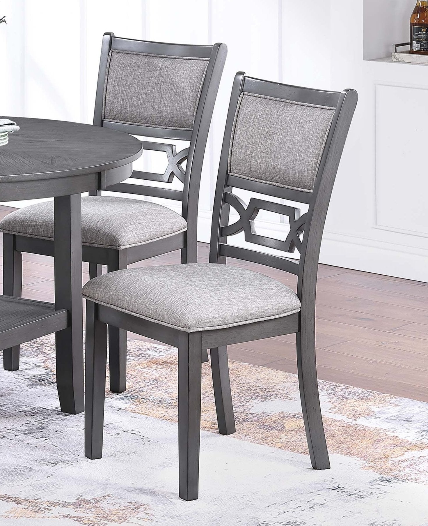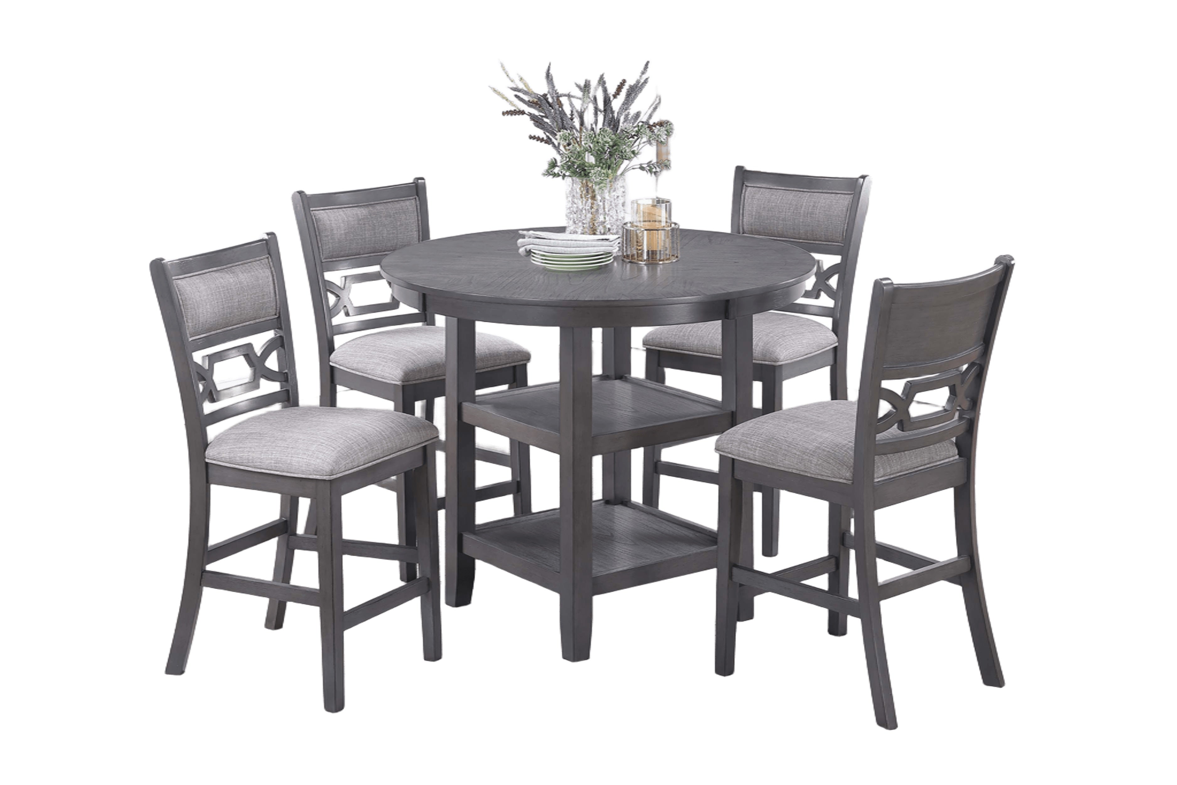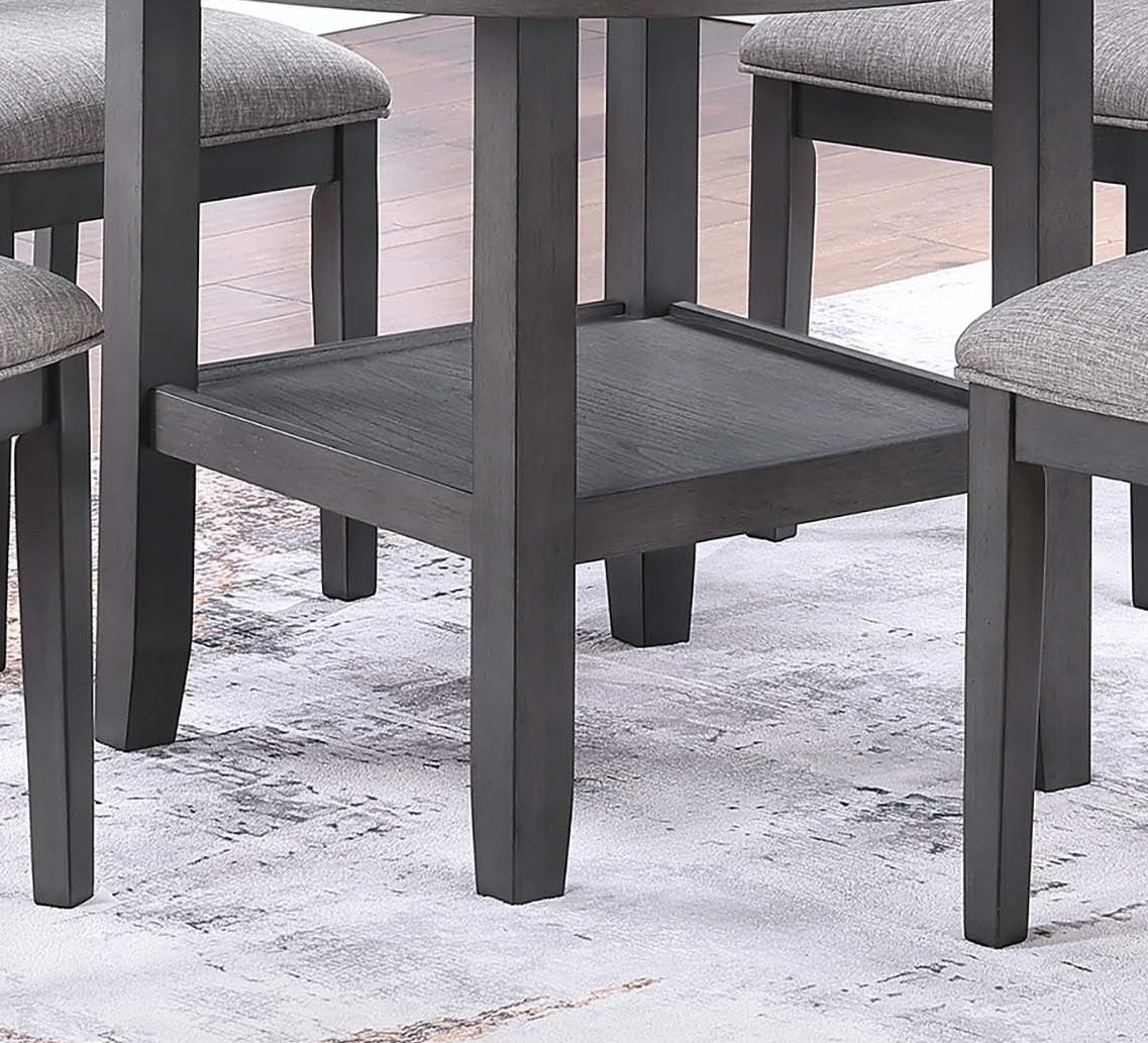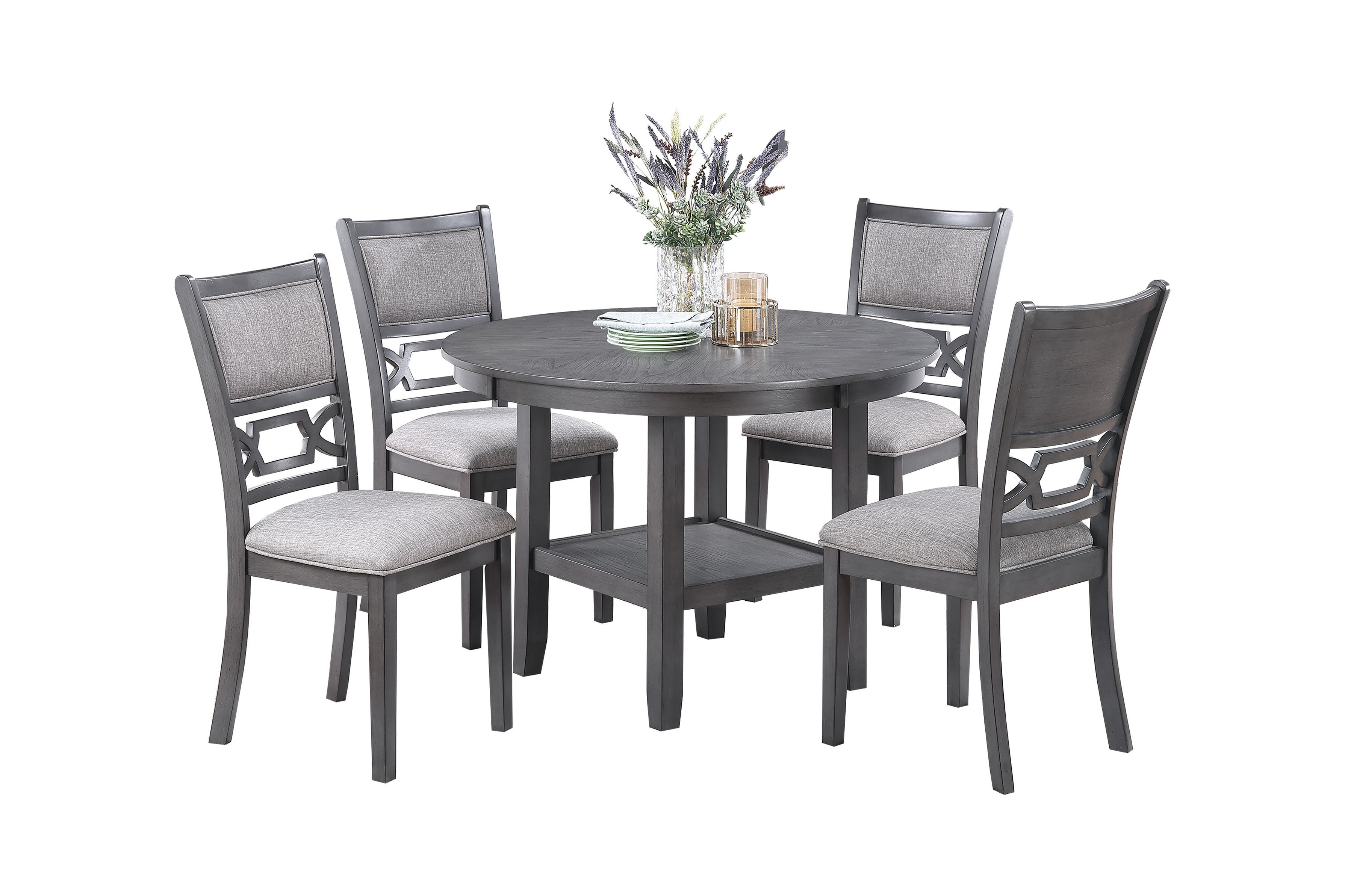 Bring effortless style and everyday comfort to your dining area with this contemporary 5-piece set. The round table's bold silhouette and charcoal-gray finish pair with four upholstered side chairs to create a cohesive look that suits small dining rooms, breakfast nooks, or open-plan living spaces. Thoughtful details — a lower shelf for extra storage and decorative open-back chair backs — make this set both attractive and functional for daily meals or casual entertaining.