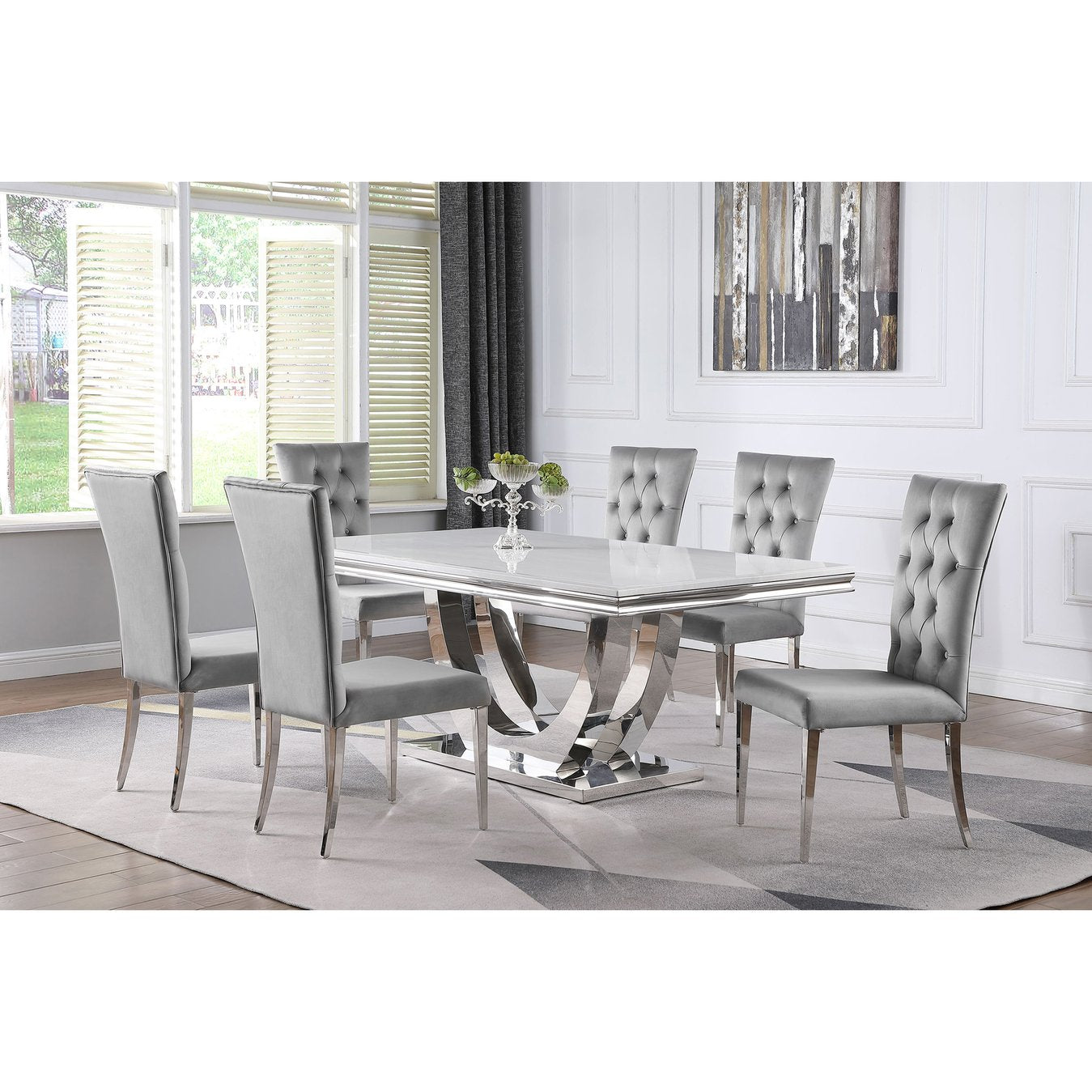 Elevate your dining room with a blend of modern glamour and timeless detailing. This 7-piece set pairs a sleek white faux-marble rectangular table with six Parson-inspired grey velvet side chairs, creating a refined space for intimate dinners and stylish entertaining. Polished chrome accents and thoughtful design touches—beveled tabletop edges and button-tufted chair backs—deliver both visual impact and everyday comfort.