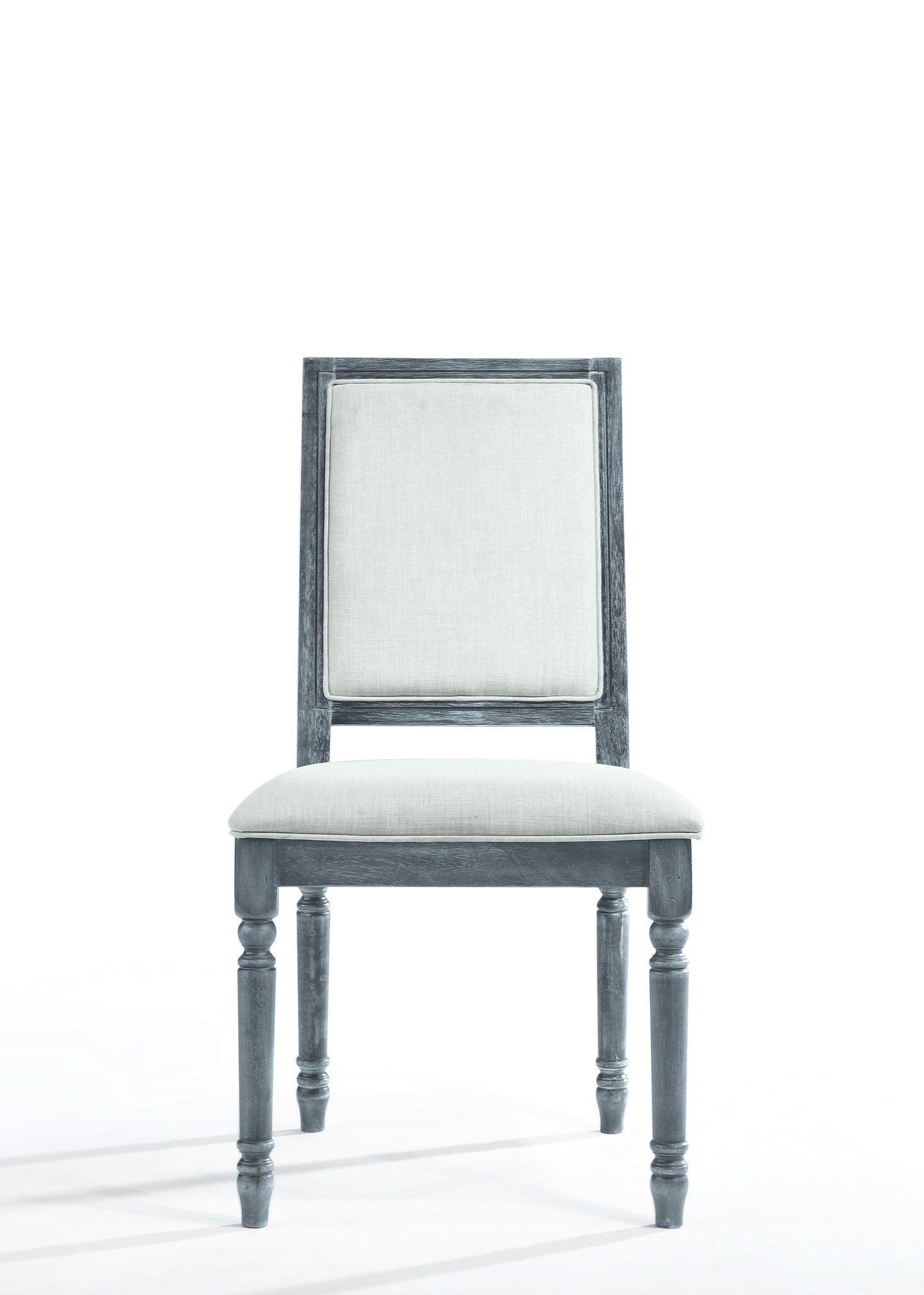 - Design notes: Neutral weathered gray and cream upholstery make the set versatile for varied décor styles; clean-lined rectangular profile complements both casual and formal dining areas.