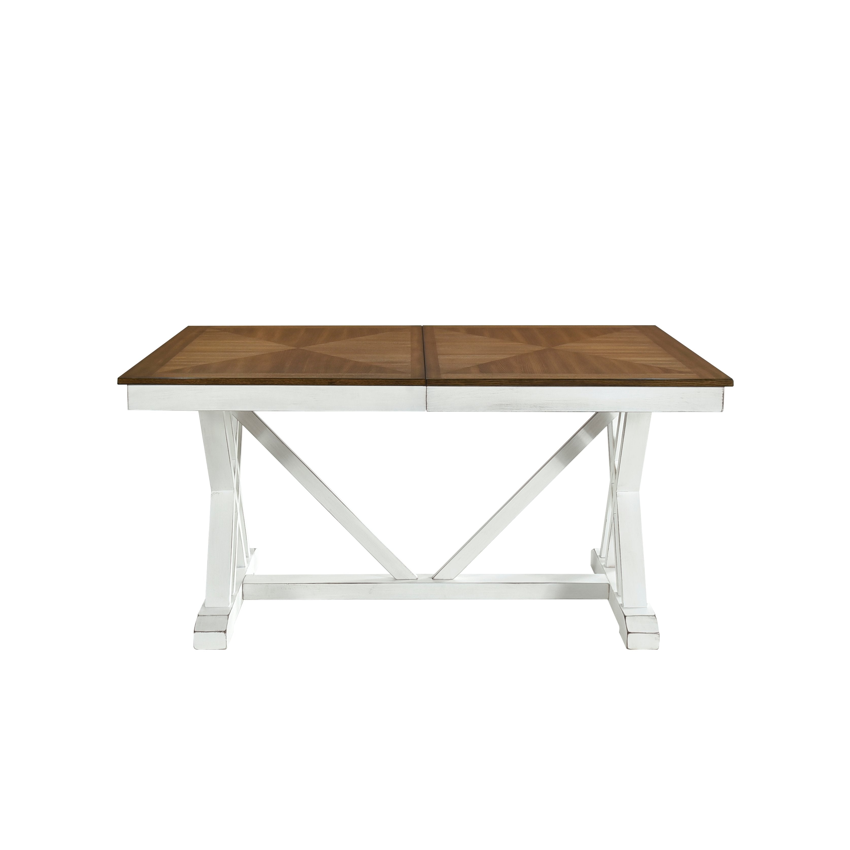 Bring farmhouse warmth and classic charm to your dining space with this two-tone white and oak finish dining set. The Brunson Collection pairs traditional silhouettes with casual comfort—featuring a butterfly extension leaf for easy tabletop expansion, an optional bench for relaxed seating, and four double x-back side chairs with neutral fabric seats for cohesive contrast. Built over oak veneer, this set adapts effortlessly to everyday meals and gatherings while maintaining a modern farmhouse aesthetic.