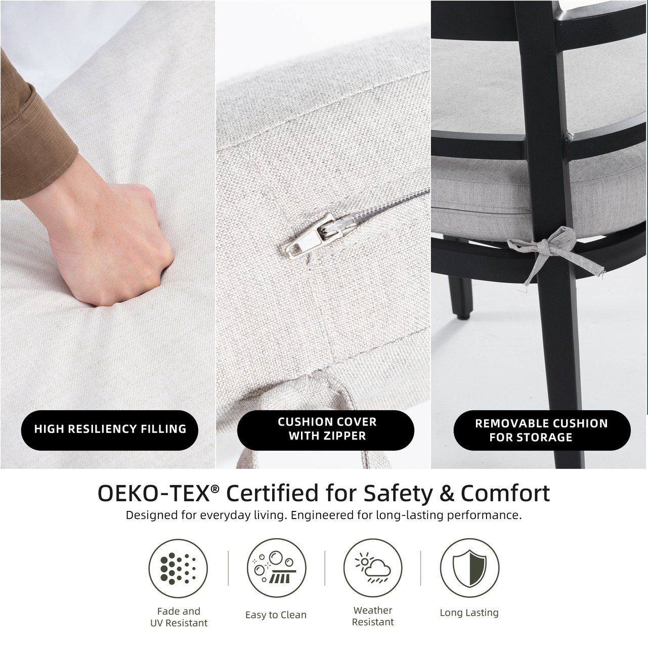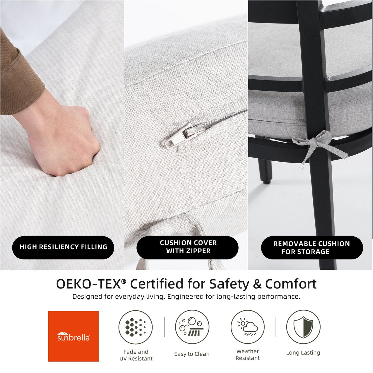 - Cushions & Fabric: Sunbrella fabric cushions—fade-resistant, easy to clean, and built for extended outdoor exposure