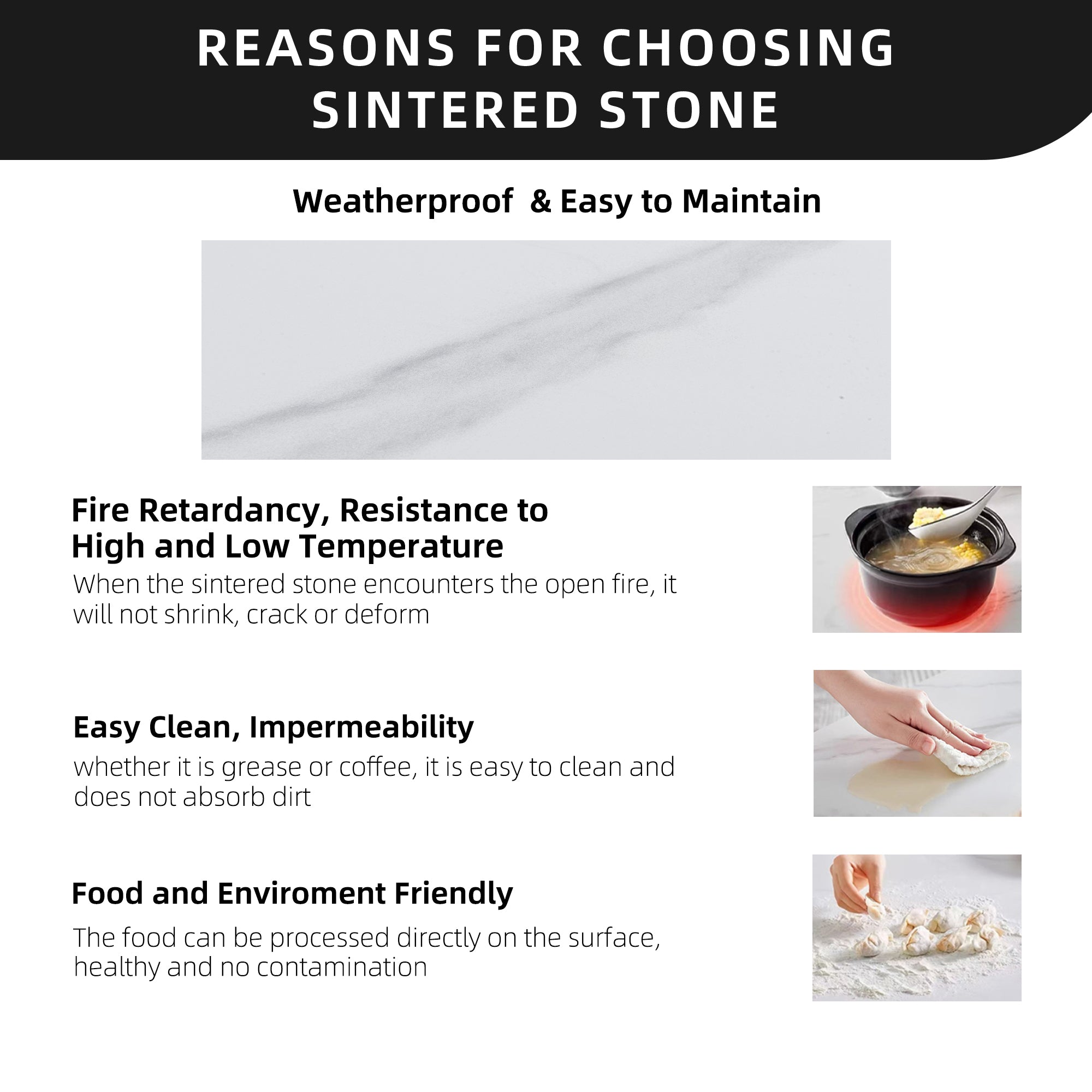 - The tabletop is crafted from high-quality Greek white marble-inspired sintered stone, offering a luxurious and natural aesthetic. Its exceptional durability, resistance to minor scratches, and weatherproof performance make it ideal for outdoor use.