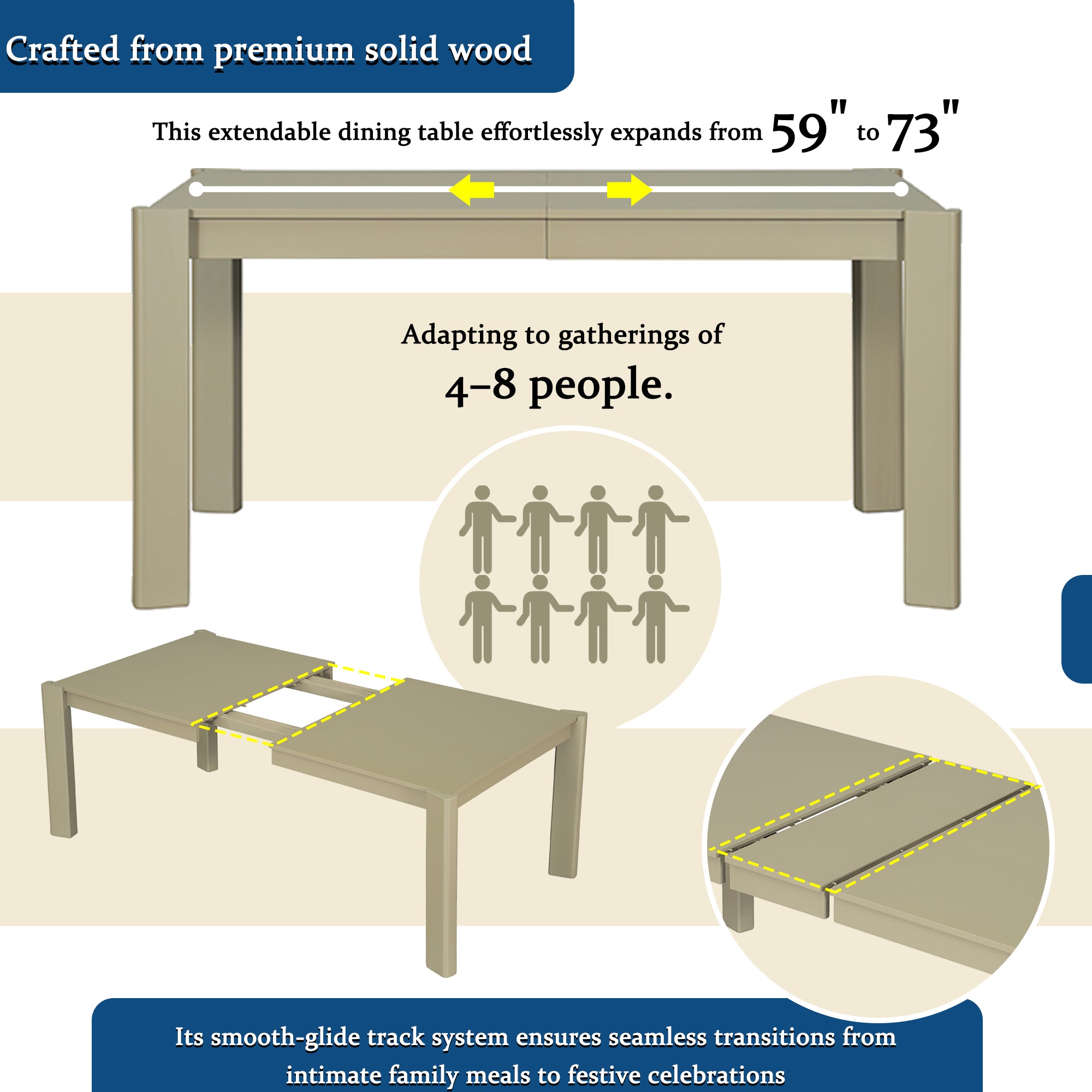 - Crafted from premium solid wood, this extendable dining table effortlessly expands from 59" to 73", adapting to gatherings of 4–8 people. Its smooth-glide track system ensures seamless transitions from intimate family meals to festive celebrations, while the space-conscious design maximizes functionality in compact homes.