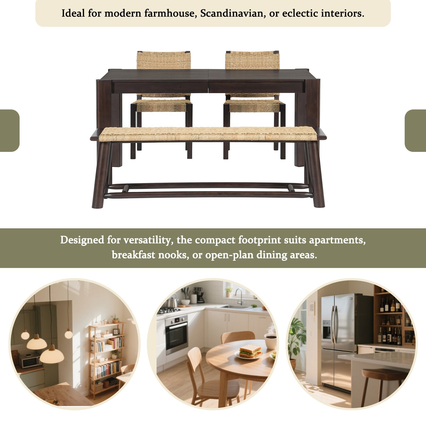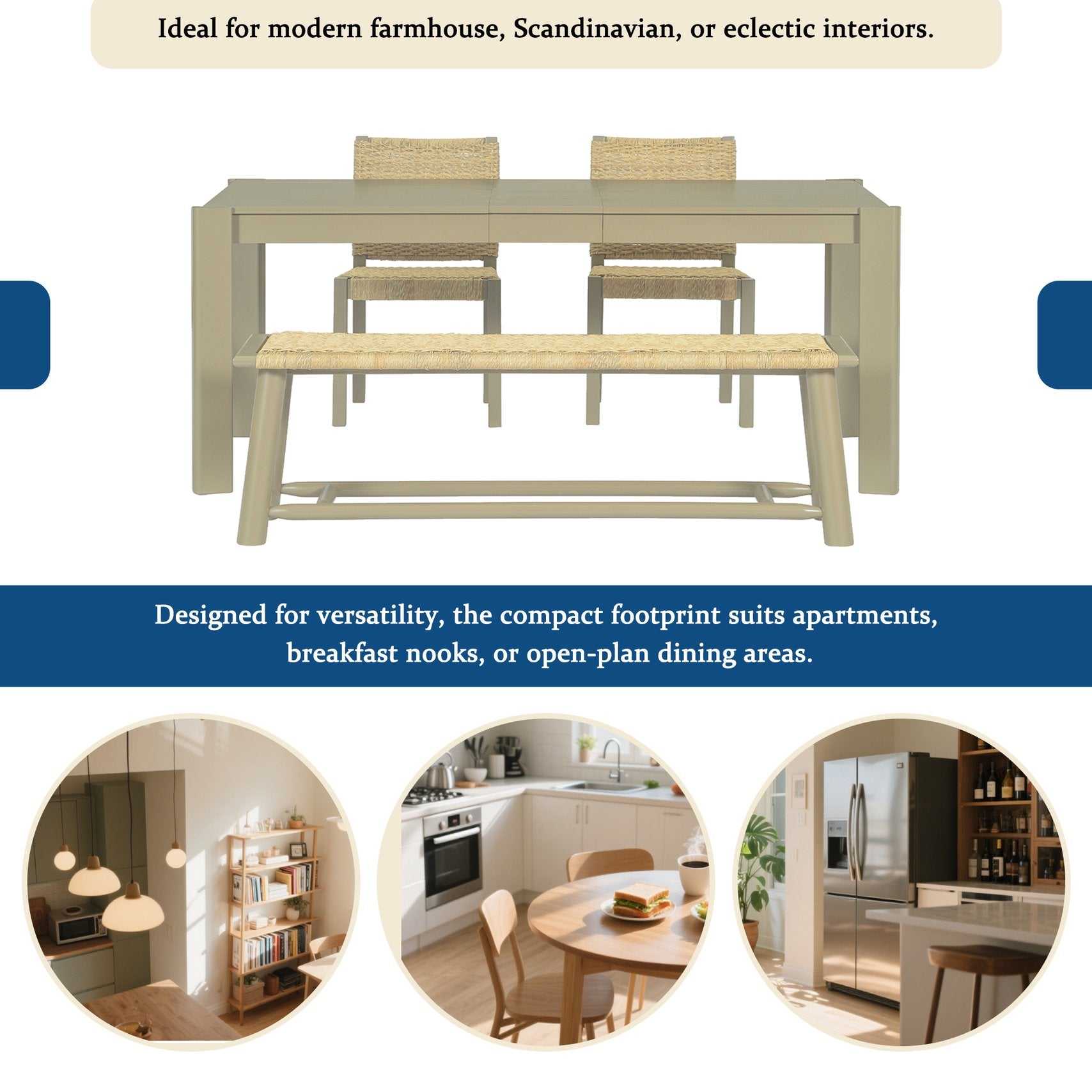 Bring timeless farmhouse charm and modern functionality to your dining space with this extendable table set, paired with solid wood chairs featuring handwoven rattan seats. Thoughtfully designed for everyday living, the set balances comfort, durability, and style—ideal for cozy dinners, entertaining, or multifunctional spaces like breakfast nooks and apartments.