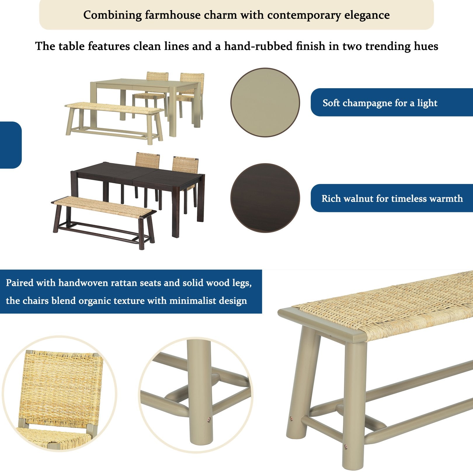 - Combining farmhouse charm with contemporary elegance, the table features clean lines and a hand-rubbed finish in two trending hues: rich walnut for timeless warmth and soft champagne for a light, airy vibe. Paired with handwoven rattan seats and solid wood legs, the chairs blend organic texture with minimalist design—ideal for modern farmhouse, Scandinavian, or eclectic interiors.