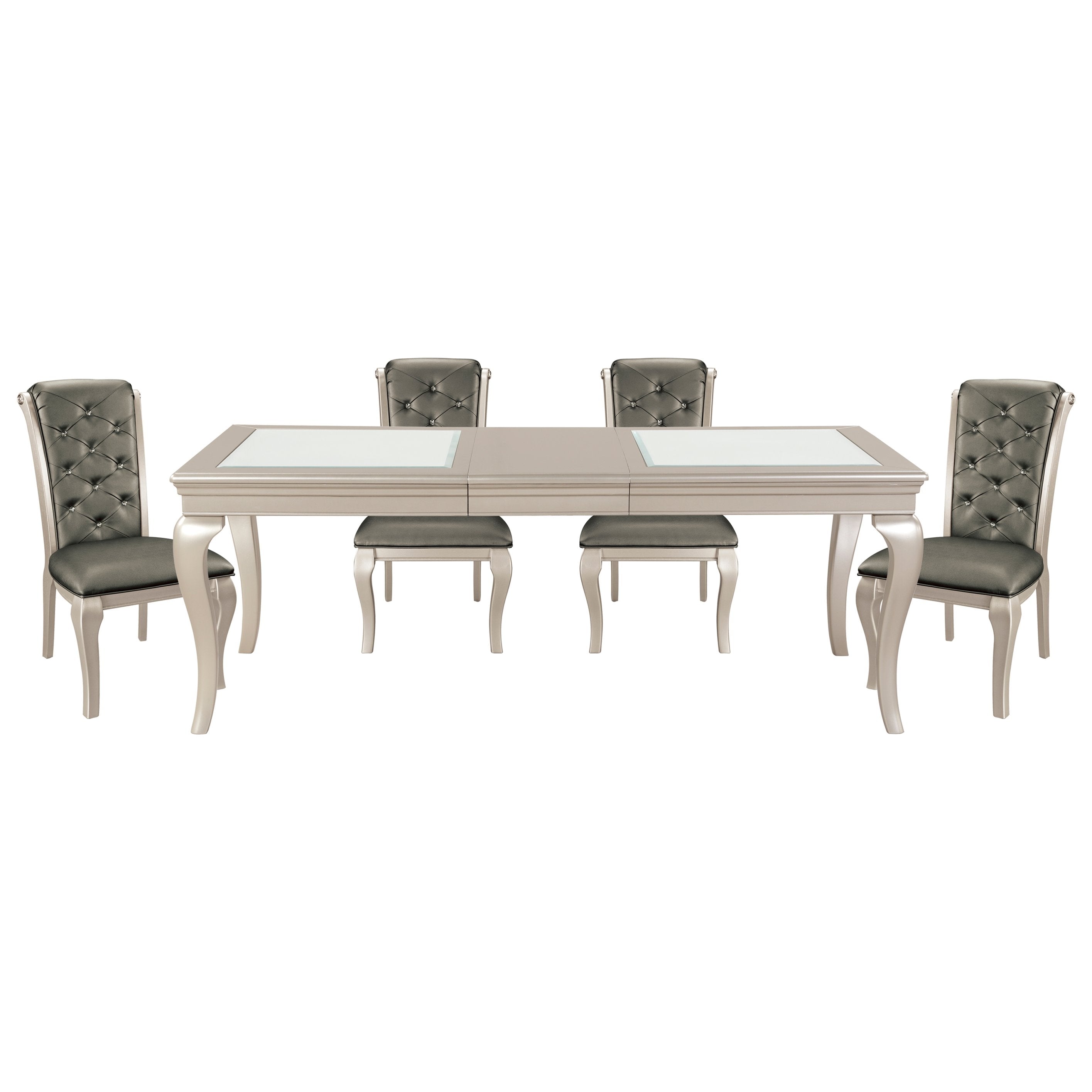 Elevate your dining room with a striking blend of traditional silhouette and modern glamour. This five-piece dining set features a silver finish, inset glass tabletop panels, and crystal button-tufted side chairs that create a luxurious yet inviting atmosphere for everyday meals and special occasions. Cabriole legs and refined detailing provide classic character while the extension leaf adds practical versatility for larger gatherings.