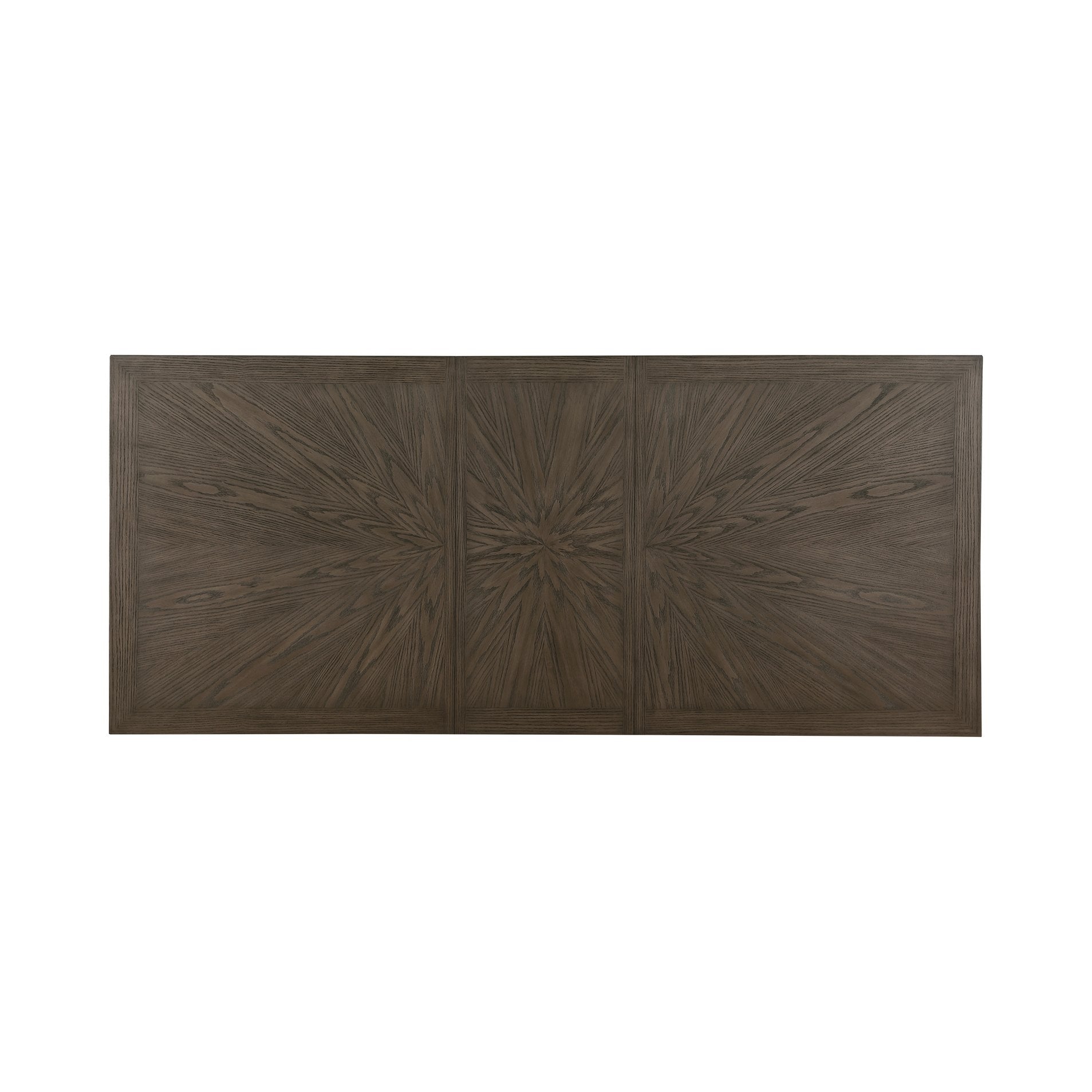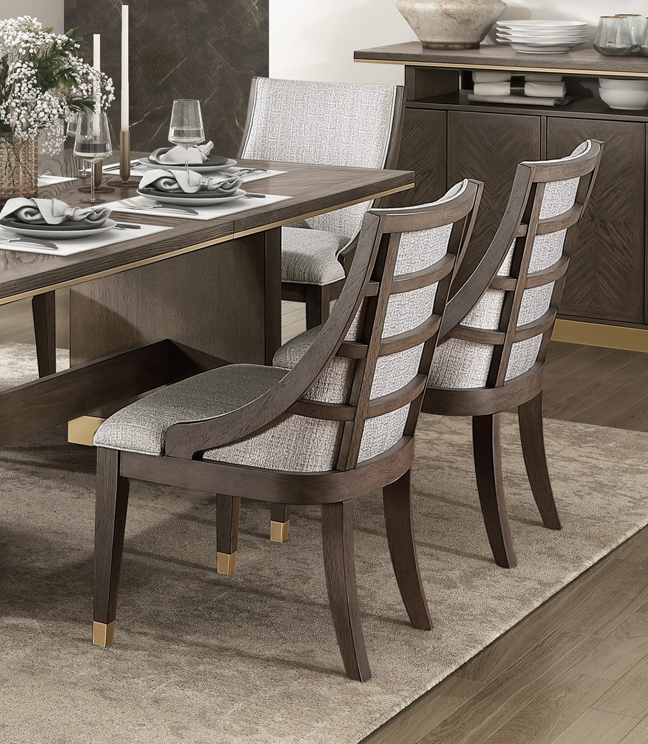 Elevate your dining room with the Griffin Collection — a modern-luxury 7-piece set that combines clean contemporary lines with warm, refined finishes. The rich brown sunburst oak veneer and tasteful gold metal tipping create a sophisticated focal point, while the upholstered armchairs and self-storing extension leaf provide comfort and flexible seating for everyday meals and special occasions.