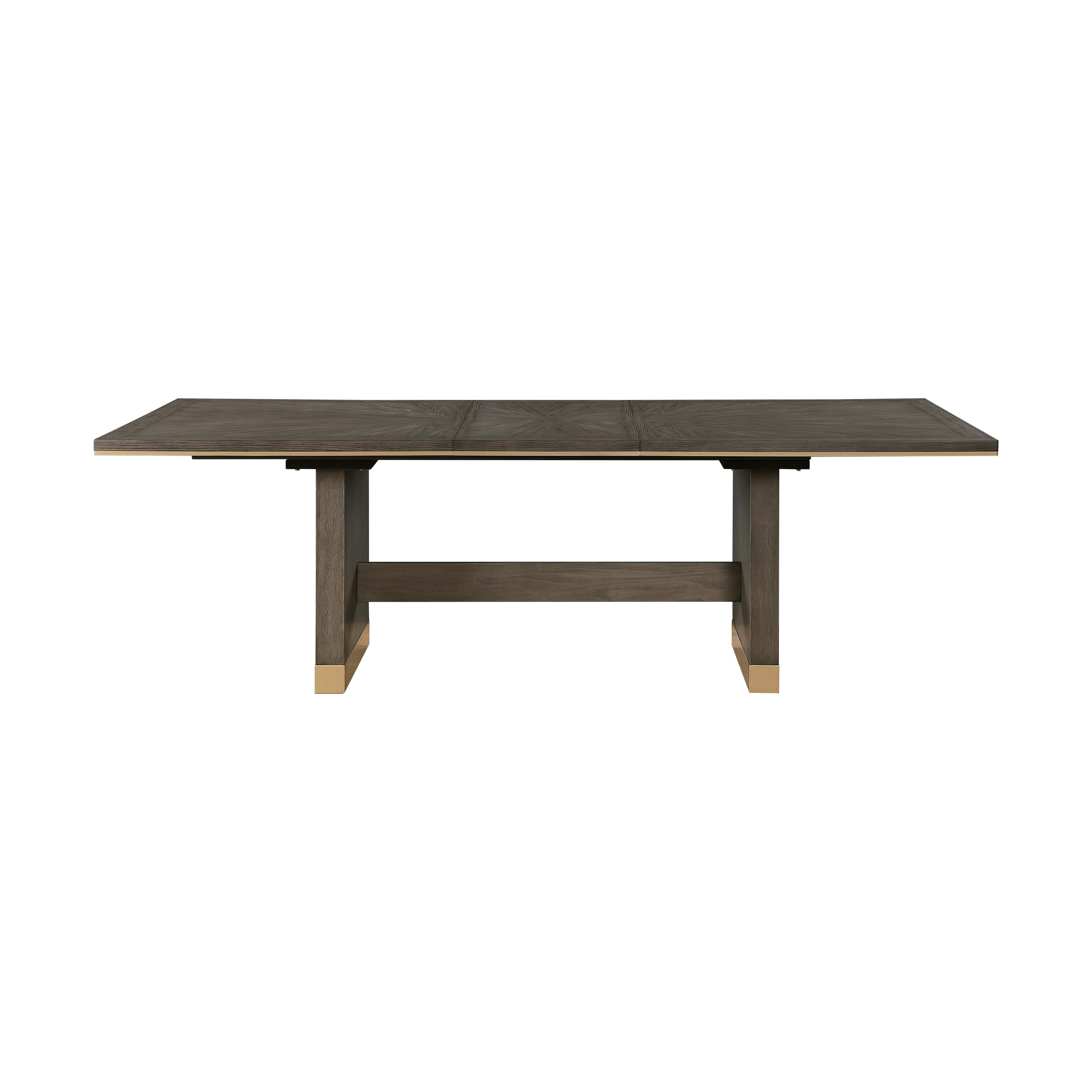- Table finish & design: Brown sunburst oak veneer top with gold-finish metal banding on the apron and trestle base for an upscale contrast.