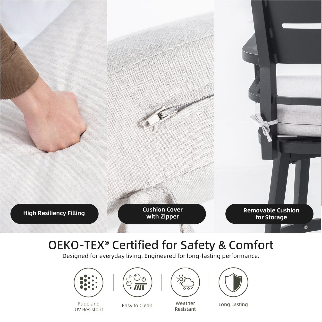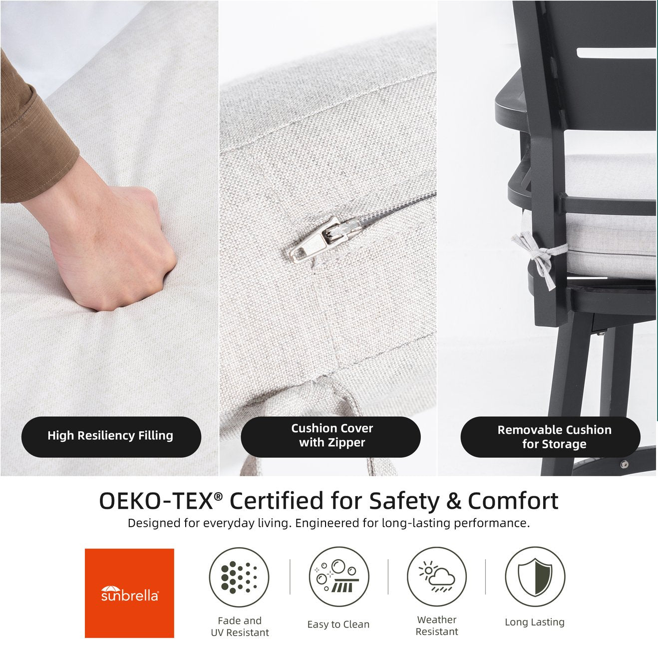- Sunbrella Fabric Cushion – Durable & Weather-Resistant – Upholstered in premium Sunbrella fabric (Cast Silver), the cushion is thicker, fade-resistant, stain-resistant, and designed for outdoor durability. The removable high-density foam cushion offers great resilience, retains its shape, and features a zippered cover for easy cleaning.