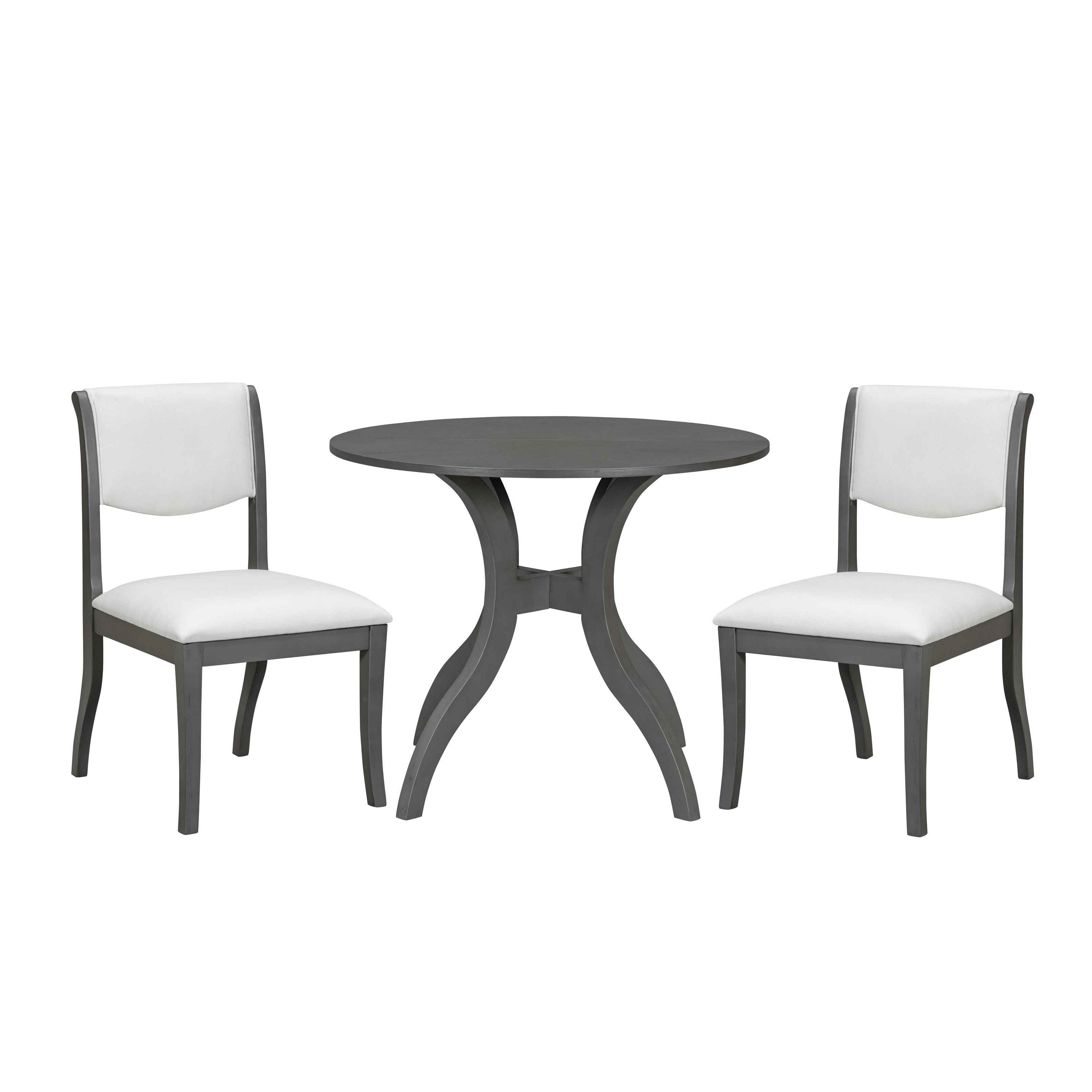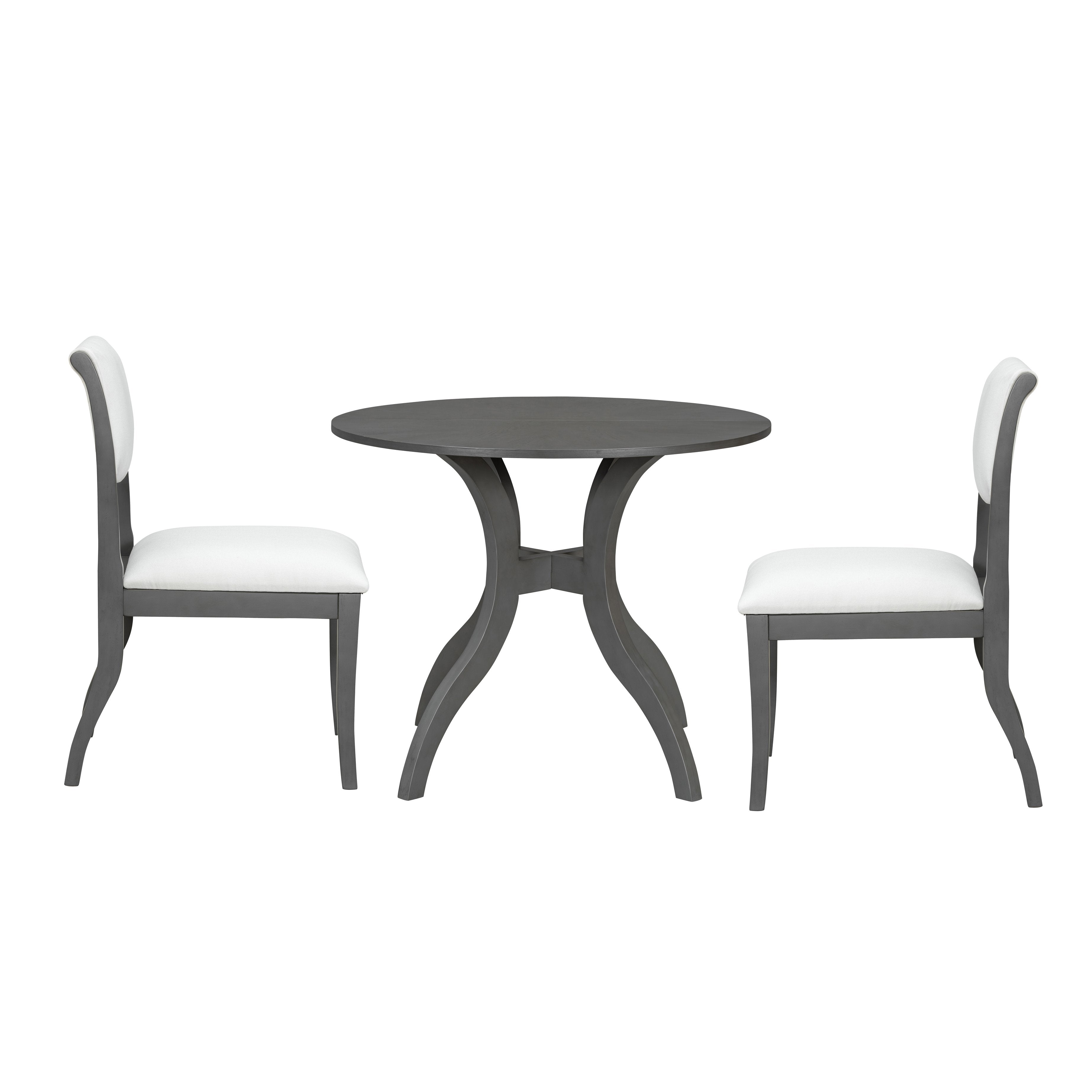 An elegant, compact dining set that combines traditional craftsmanship with modern comfort—perfect for kitchens, breakfast nooks, or small dining rooms. The set includes a 39.4" round oak-gray table with an inlaid tabletop and two upholstered chairs, delivering a polished look and durable construction for everyday use and casual entertaining.