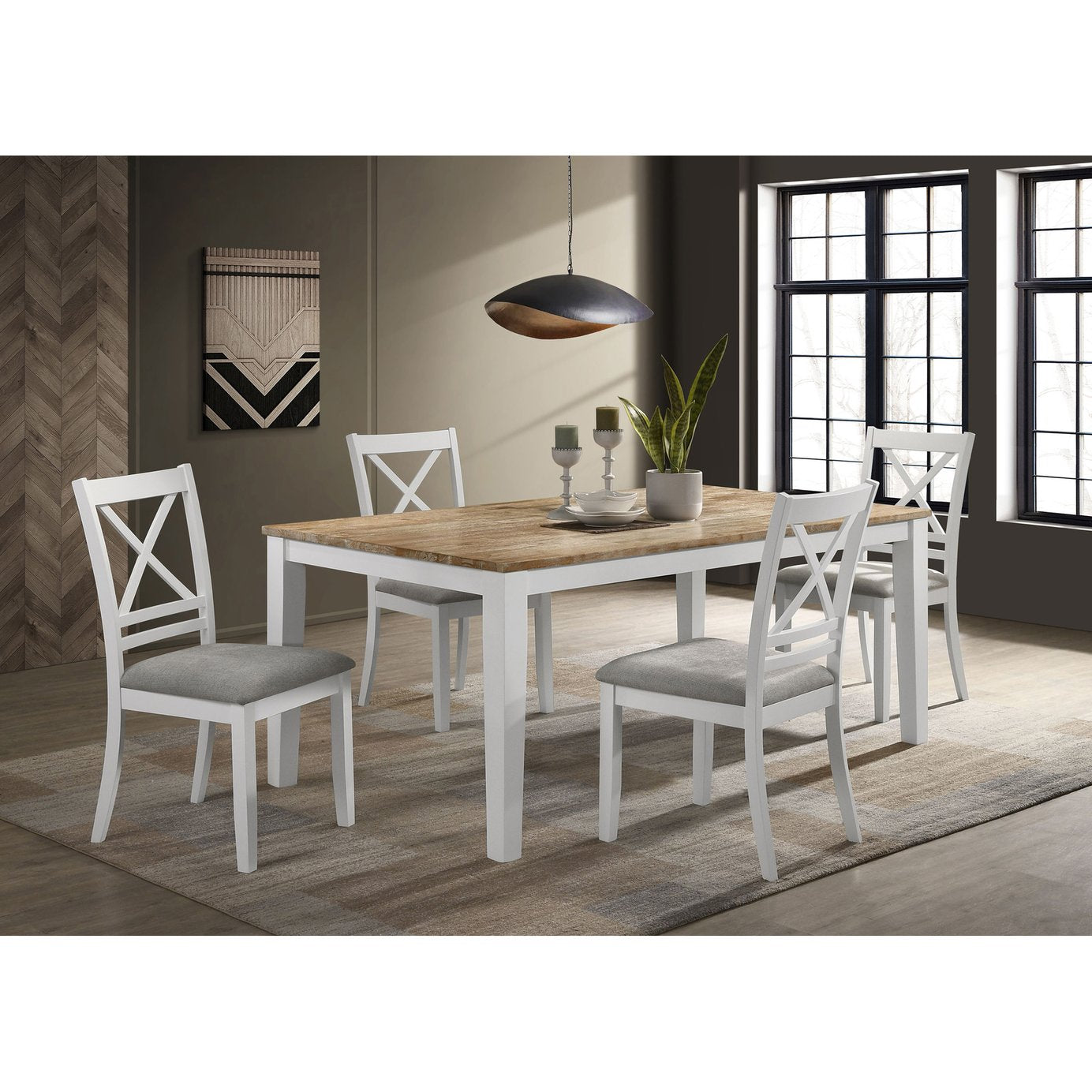 - Five-piece cottage dining set includes a two-tone rectangular table and four chairs featuring a white finish with light gray upholstery