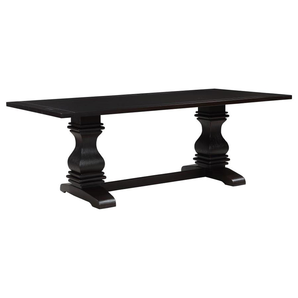 - Table features: Solid, intricately carved trestle pedestal base in a rustic espresso finish for stability and visual impact; generous rectangular tabletop ideal for family dinners and entertaining
