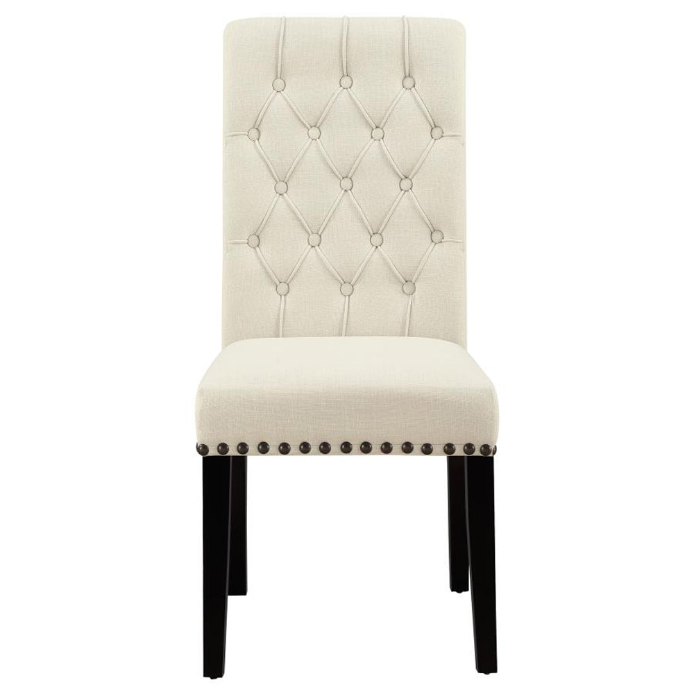 - Rustic espresso wood finish contrasts beautifully with cream-colored tufted parson chairs accented by sophisticated nailhead trim