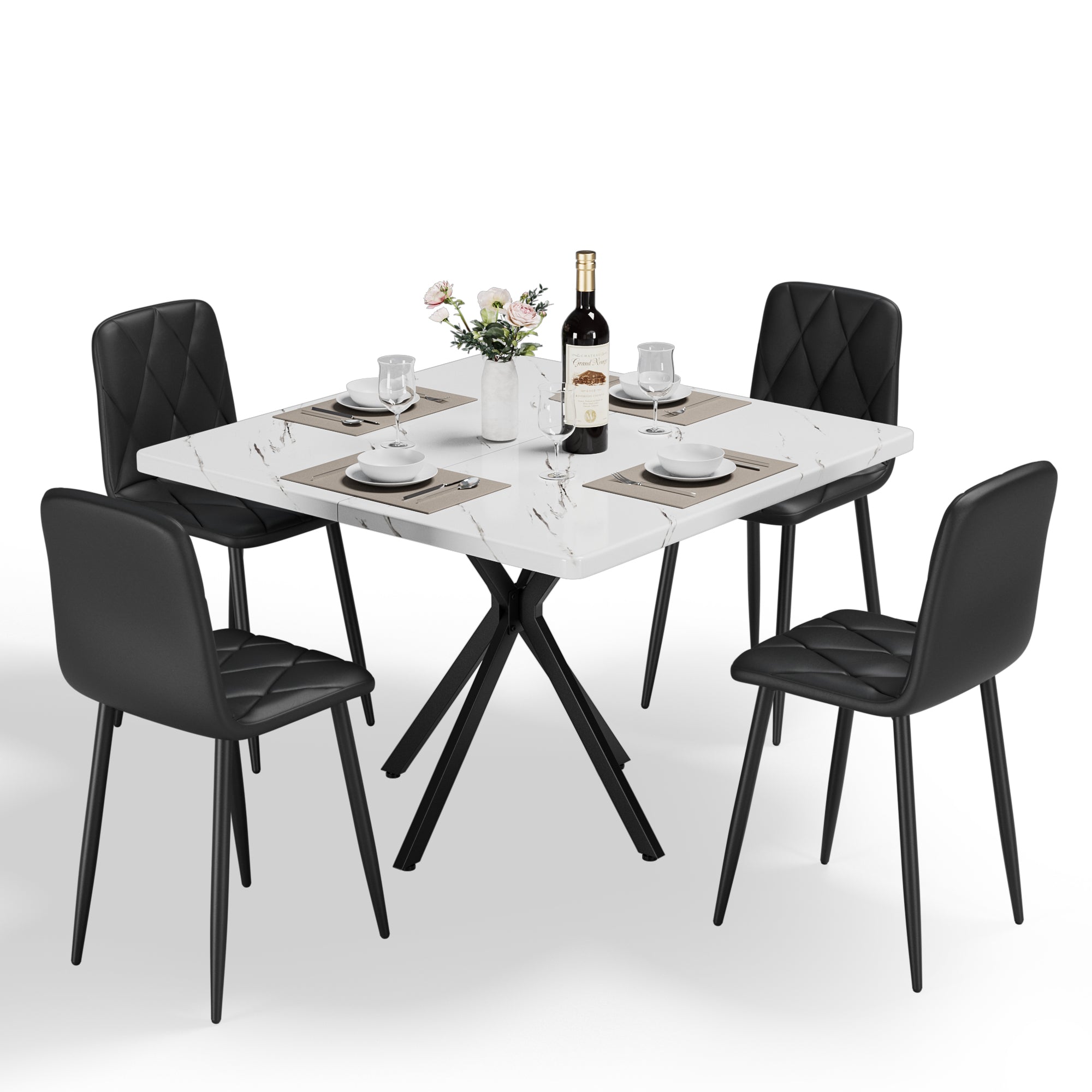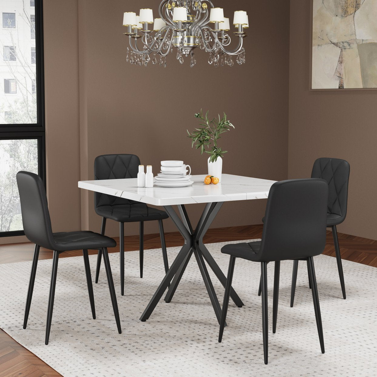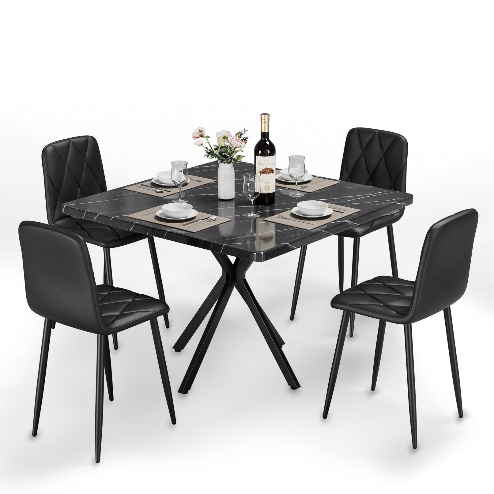 - Square Dining Table Set for 4: The square dining table set includes 1 dining table and 4 leather chairs. Square dining table maximizes the dining area. Unique textured finish to match any style of home decor.