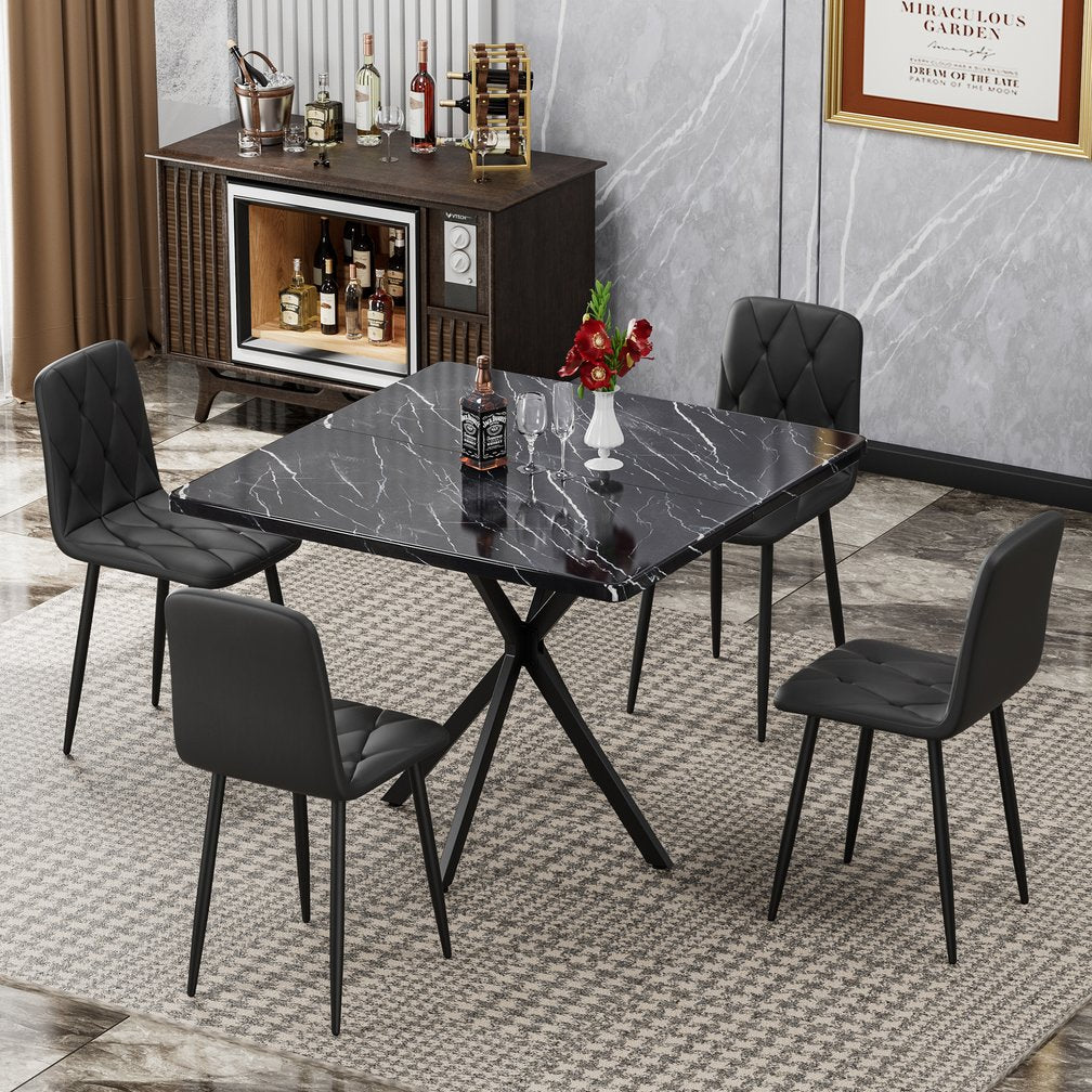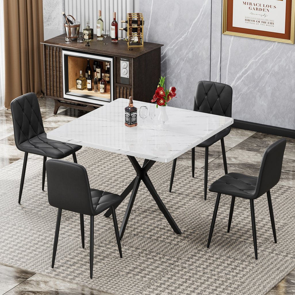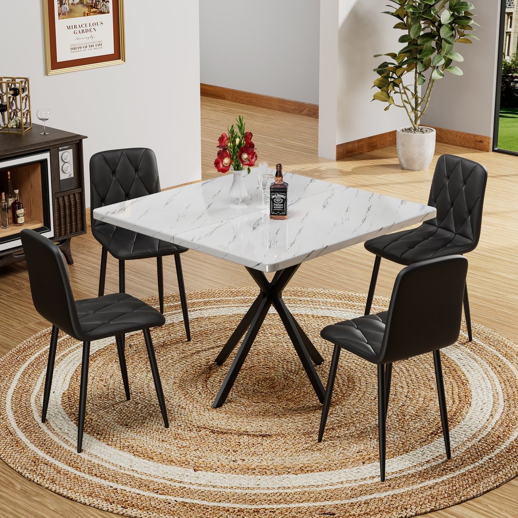 - Square Dining Table: This square kitchen table is crafted from thicker MDF material, thick desktop Board can be used for a long time without deformation. Square dining table features faux marble tabletop. Its modern glam and elegance seamlessly integrate with your existing decor, adding a touch of luxury to your dining space. Four iron legs support the stable table. The bottom is equipped with non-slip rubber pads to protect the floor and maintain stability.