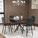 This compact mid-century modern dining set brings style and space-saving functionality to your kitchen, dining room, office, or small apartment. The faux marble MDF tabletop offers a clean, durable surface with elegant veining, while the iron legs provide stable support and a minimalist silhouette that complements contemporary interiors. Designed for four people, the set balances comfort and easy maintenance—perfect for everyday meals or casual gatherings.