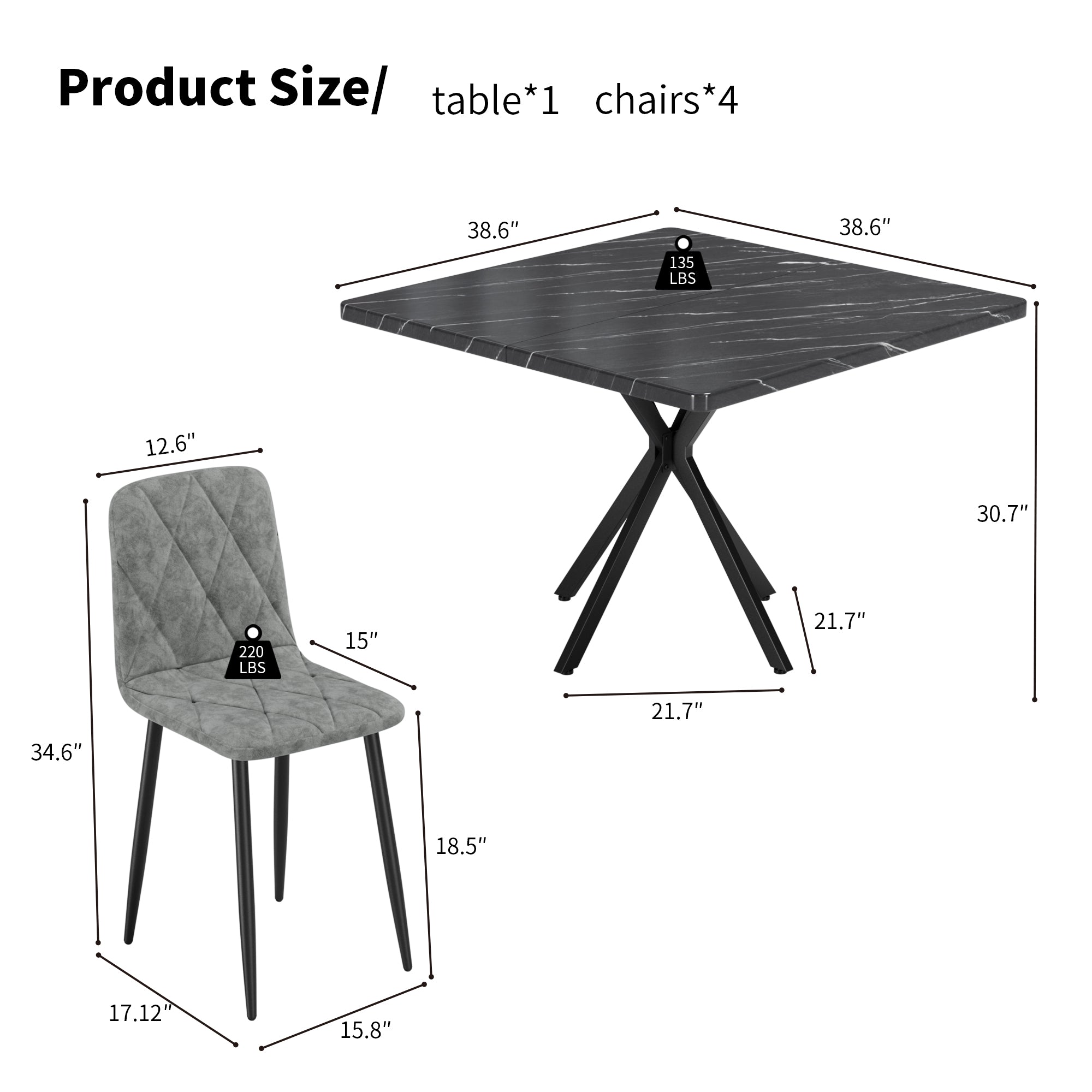 - Key dimensions: Table: 38.6 × 38.6 × 30.2 in (W × D × H); Chairs: 15.8 × 15 × 34.7 in (W × D × H)