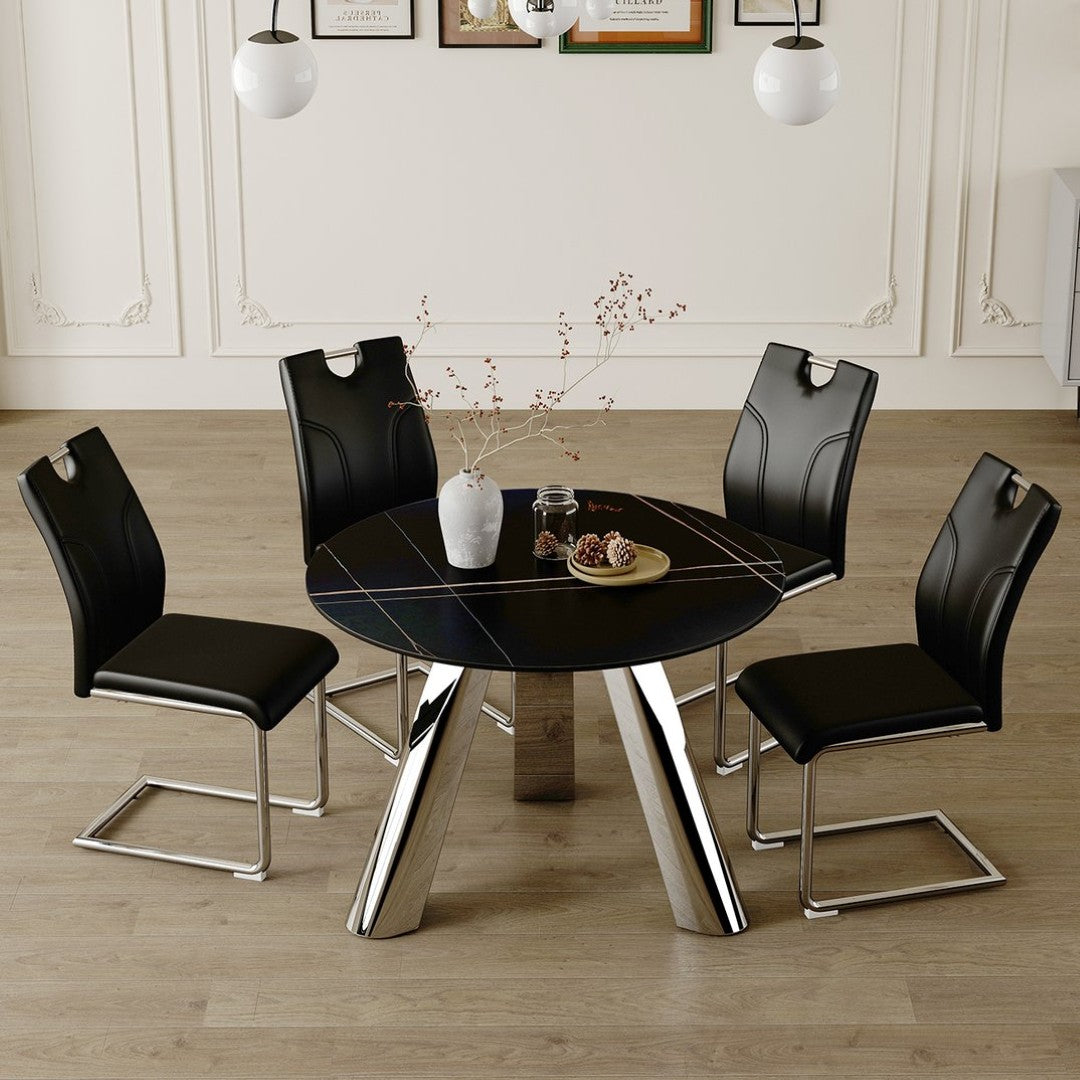 Elevate your dining space with this contemporary 5-piece set that blends sculptural design with durable, low-maintenance materials. The round sintered stone tabletop and polished stainless steel legs create a refined centerpiece, while four ergonomically shaped black chairs offer comfortable seating and cohesive modern styling for everyday meals or entertaining.