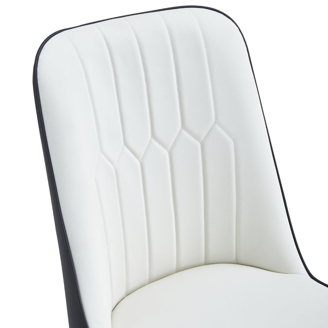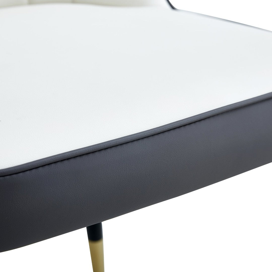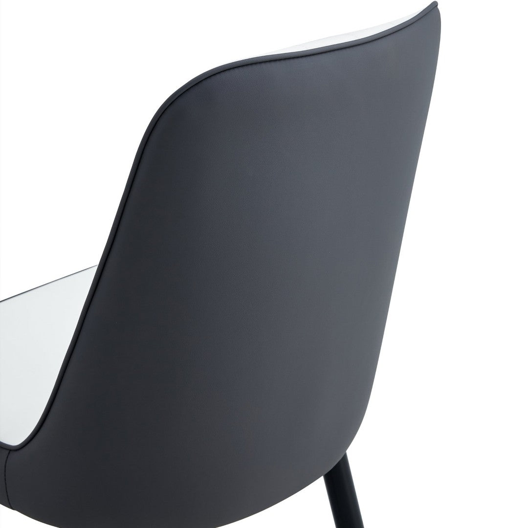 - The accompanying chairs are designed in white and dark gray spliced color, with black metal chair legs,simple yet luxurious.The chairs are filled with sponge for a soft and comfortable sitting experience.The chairs are designed according to ergonomics, providing a more comfortable sitting posture, with simple line designs on the backrest.