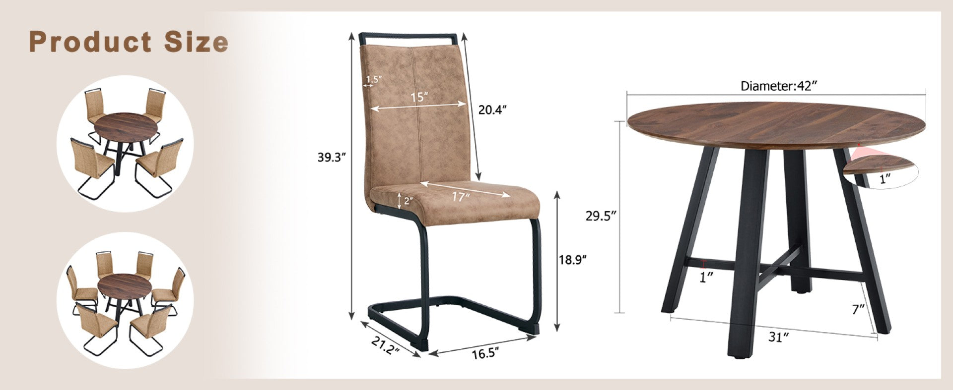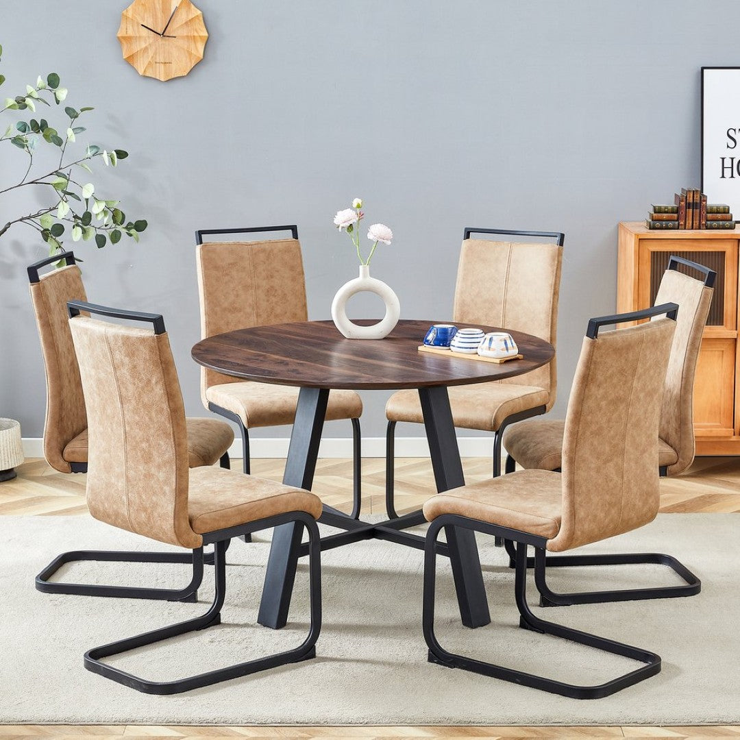 Bring modern simplicity and everyday comfort to your dining space with this 6-chair set centered around a 42-inch round table. Clean lines, a dark walnut tabletop, and brown technology fabric chairs with arched black legs create a cohesive, contemporary look that fits kitchens, dining rooms, and multipurpose spaces. Designed for durability and easy maintenance, this set balances style and practicality for family meals and casual gatherings.