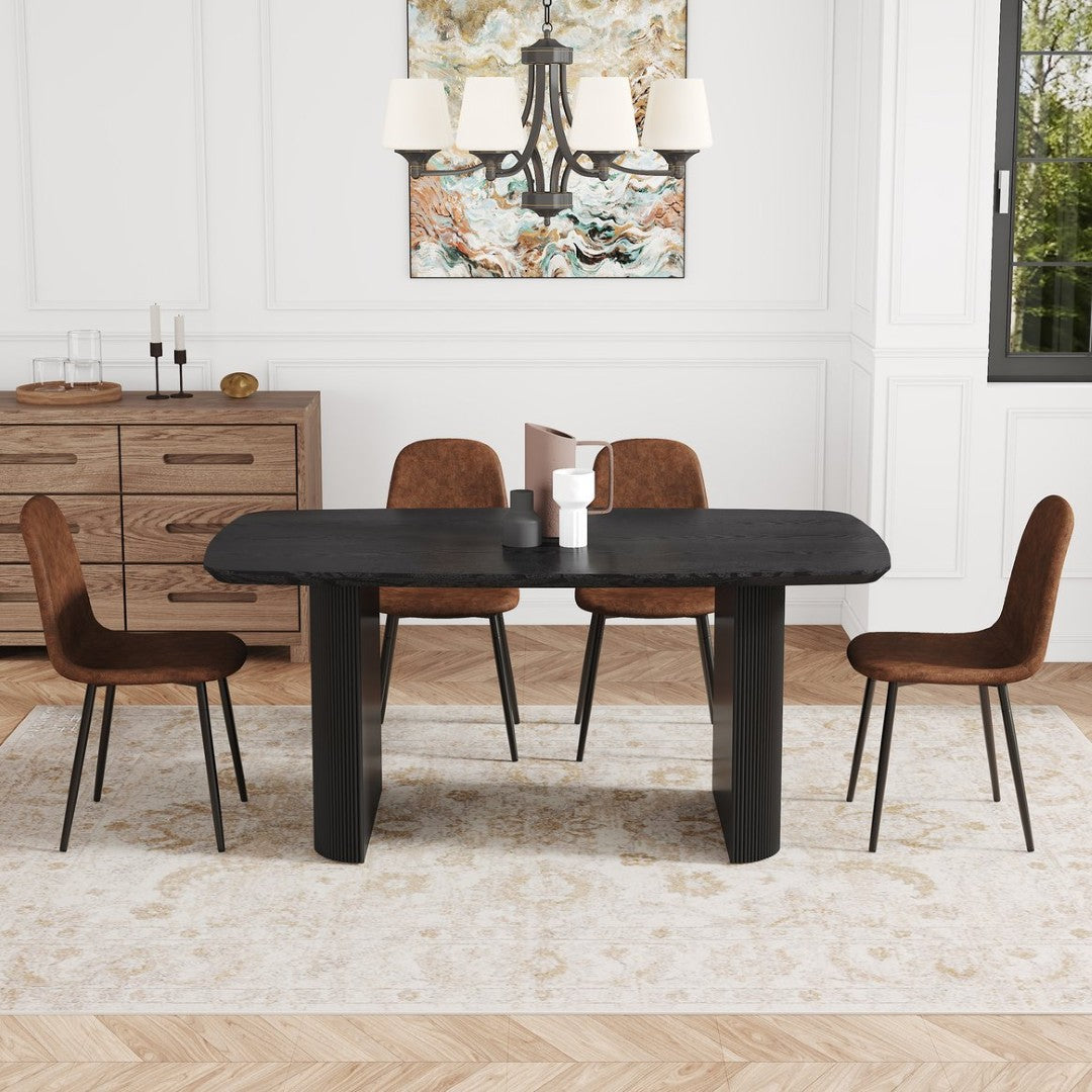A stylish and practical dining set that balances contemporary design with everyday durability. The 67 x 35.4 inch black wood-grain MDF table provides a spacious, easy-care surface for family meals and entertaining, while four brown techno-fabric chairs with black metal legs deliver comfortable, supportive seating. Thoughtfully finished details — wear-resistant tabletop coating, ergonomic chair contours, and non-slip feet — make this set a reliable, low-maintenance choice for modern homes.