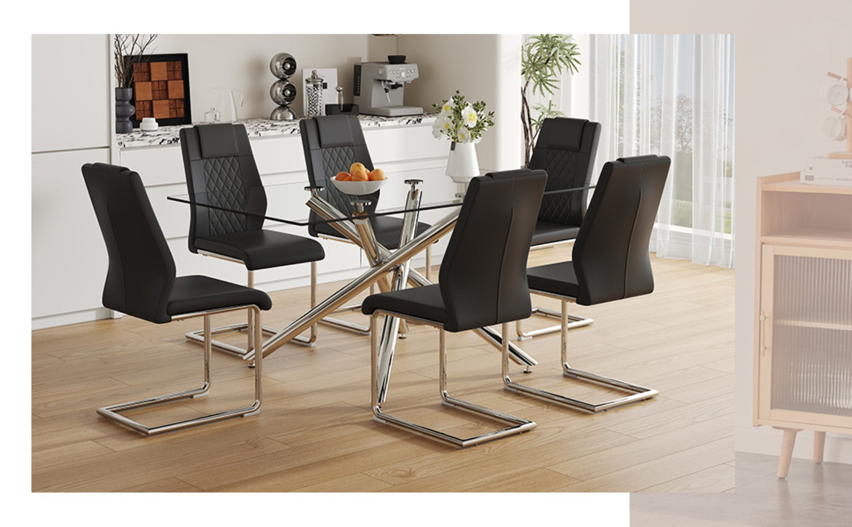 Elevate your dining space with this modern, luxurious 7-piece dining set featuring a transparent tempered glass table and six black PU chairs with silver metal legs. Designed for both style and everyday practicality, the set blends high-quality materials, ergonomic comfort, and a coordinated contemporary aesthetic that suits family meals, entertaining, or work-from-home dining.